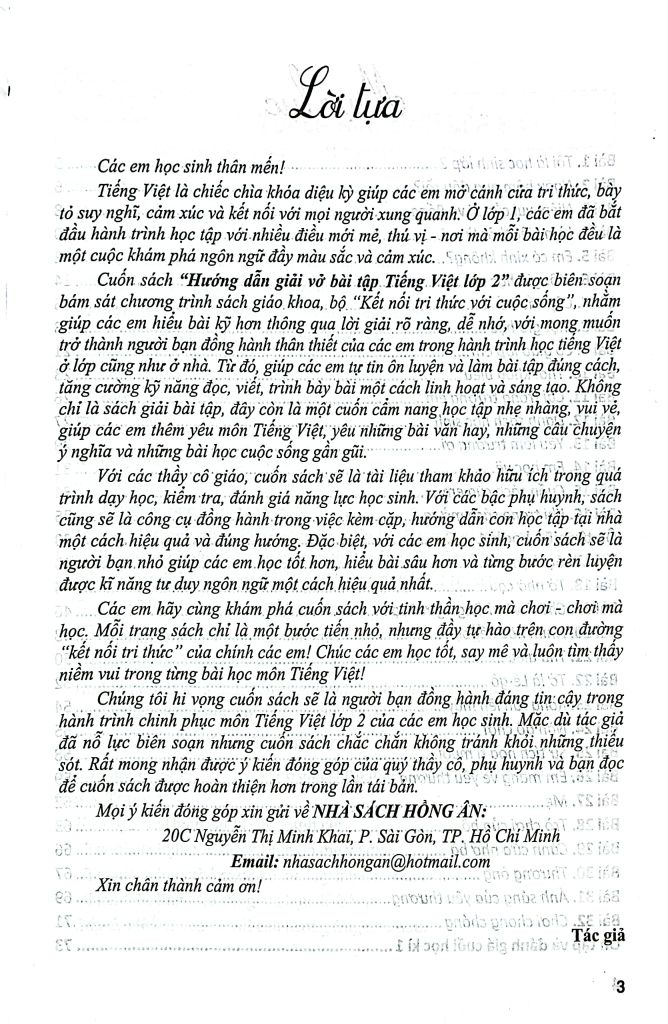 Chúng tôi hi vọng cuốn sách sẽ là người bạn đồng hành đáng tin cậy trong hành trình chinh phục môn Tiếng Việt lớp 2 của các em học sinh. Mặc dù tác giả đã nỗ lực biên soạn nhưng cuốn sách chắc chắn không tránh khỏi những thiếu sót. Rất mong nhận được ý kiến đóng góp của quý thầy cô, phụ huynh và bạn đọc để cuốn sách được hoàn thiện hơn trong lần tái bản.