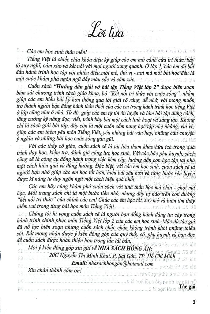 Chúng tôi hi vọng cuốn sách sẽ là người bạn đồng hành đáng tin cậy trong hành trình chinh phục môn Tiếng Việt lớp 2 của các em học sinh. Mặc dù tác giả đã nỗ lực biên soạn nhưng cuốn sách chắc chắn không tránh khỏi những thiếu sót. Rất mong nhận được ý kiến đóng góp của quý thầy cô, phụ huynh và bạn đọc để cuốn sách được hoàn thiện hơn trong lần tái bản.