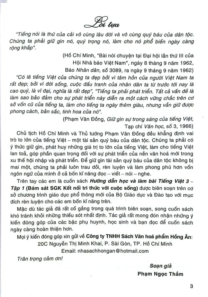 Trên tay các em là cuốn sách Hướng dẫn học và làm bài Tiếng Việt 3 – Tập 1 (Bám sát SGK Kết nối tri thức với cuộc sống) được biên soạn trên cơ sở chương trình giáo dục phổ thông mới của Bộ Giáo dục và Đào tạo với mục đích rèn luyện cho các em bốn kĩ năng trên.