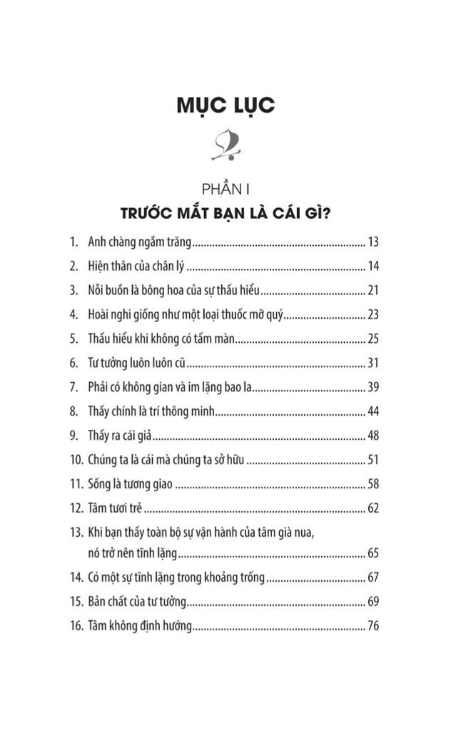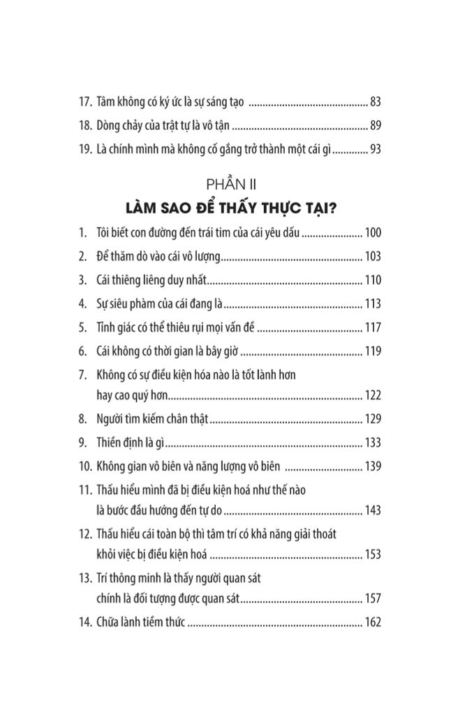 Thông qua ba phần lớn Trước Mắt Bạn Là Cái Gì - Làm Sao Để Thấy Thực Tại - Thực Tại Hiện Tiền, cuốn sách J. Krisnamurti Thực Tại Hiện Tiền sẽ bàn về những điều sâu sắc và đẹp đẽ đó, những điều tưởng như mờ hồ nhưng luôn hiện hữu quanh ta và ảnh hưởng tới toàn bộ đời sống thân và tâm của chúng ta.
