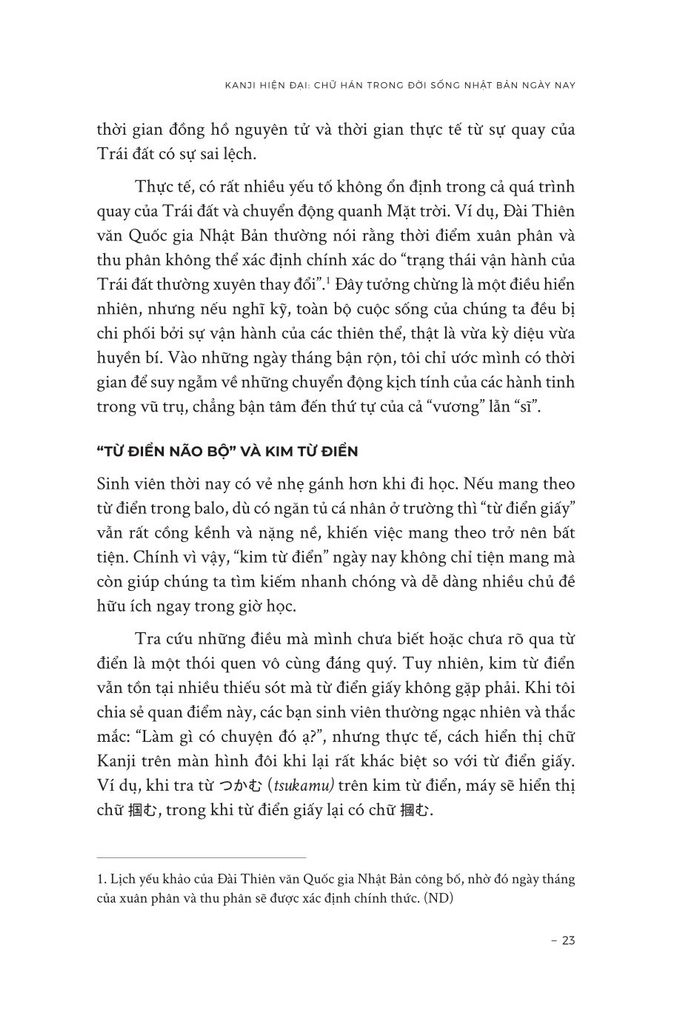 Cuốn sách này được tổng hợp dựa trên loạt bài viết có tiêu đề “Kanji ngày nay'' được đăng trên trang chủ của nhà xuất bản Sanseido. Khi soạn thành sách, tôi đã bổ sung thêm khá nhiều nội dung. Ngoài việc thêm nhiều đoạn, tôi cũng thay thế một số hình ảnh minh họa. Những sự kiện đến rồi đi, dường như mờ nhạt giữa dòng chảy thường nhật, nay được tôi ghi chép lại một cách khách quan. Nhờ việc duy trì thói quen viết lách đều đặn, tôi có cơ hội xâu chuỗi suy nghĩ và tổng hợp những ý tưởng của mình. Theo thời gian, việc ghi chép ấy dần trở thành một thói quen, giúp tôi ngày càng ý thức rõ hơn về mục đích của bản thân. Kể cả khi đi chơi, tôi vẫn tự hỏi liệu khả năng cảm thụ của mình đã tiến xa đến đâu. Trong cuốn sách này, tôi đã bộc bạch tất cả — những khó khăn, niềm vui, cũng như phương pháp nghiên cứu và suy ngẫm của mình.Có lần, có người hỏi tôi rằng: Làm sao anh có thể vừa nghiên cứu một cách tỉ mỉ, vừa viết lách trôi chảy đến vậy? Dù mỗi công việc có quy trình khác nhau, nhưng chúng không chỉ đơn thuần là những giờ miệt mài trên bàn làm việc. Nghiên cứu không nên là một trò chơi điên cuồng, cũng không nên là một cuộc thí nghiệm đầy khổ sở. Một phần của quá trình ấy—cả những gì đã thành hình lẫn những gì còn dang dở — sẽ xuất hiện đâu đó trong cuốn sách này.