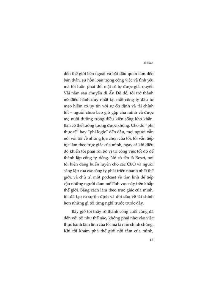 Tác giả Liz Tran – một huấn luyện viên kinh doanh, giám đốc công nghệ, người chữa lành Reiki, và nhà lãnh đạo tinh thần – sẽ chỉ cho bạn Bốn trụ cột của chiến lược tâm linh: hiểu rõ nội tâm, thực hành chánh niệm, nuôi dưỡng năng lượng, và tăng cường trí tuệ. Bên cạnh đó, bạn sẽ được truyền cảm hứng từ những câu chuyện về các nhà lãnh đạo và những cá nhân đã phát huy tối đa tiềm năng bằng cách sử dụng trực giác của họ.