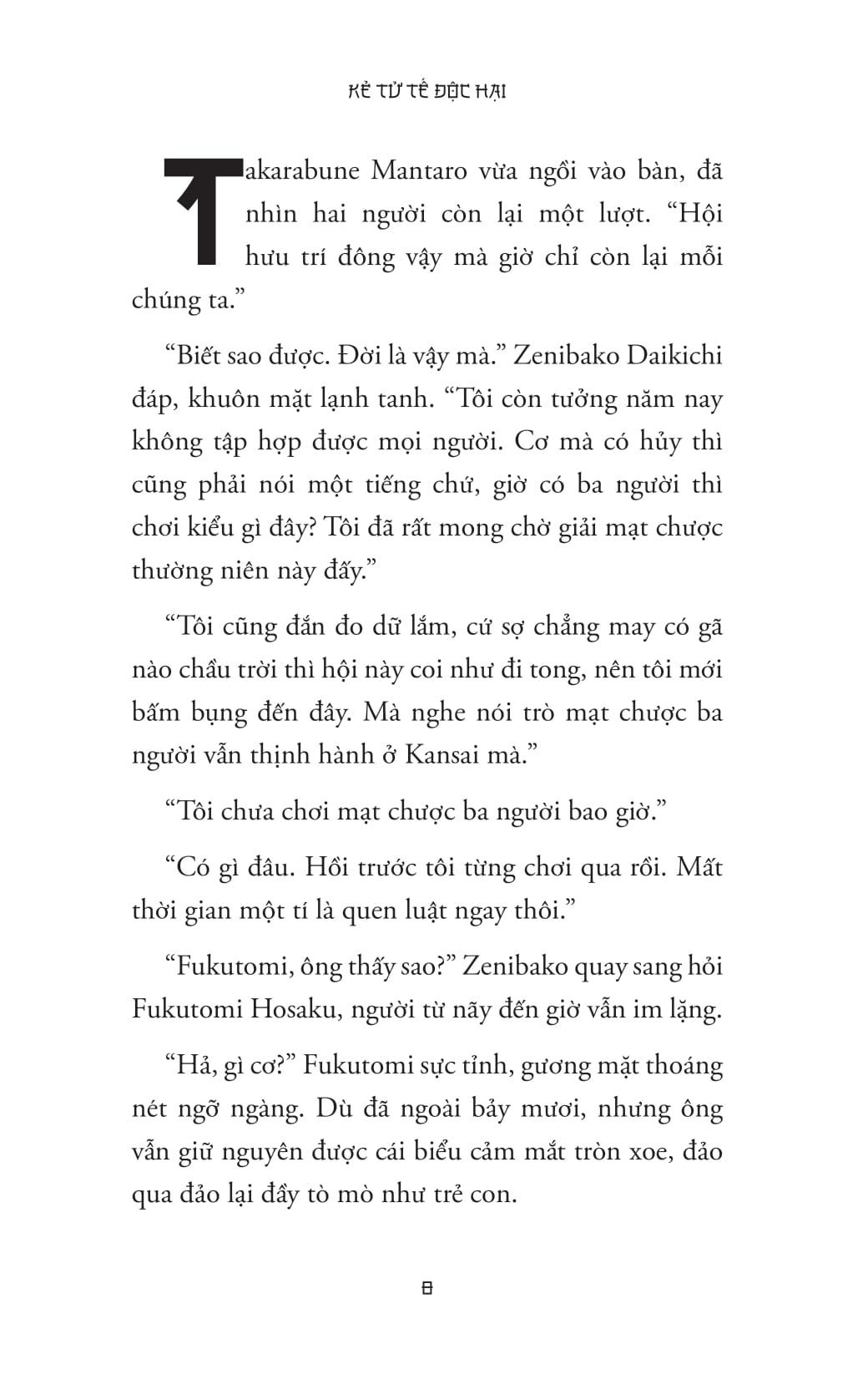 - “Tôi đọc các truyện theo thứ tự. Đang đọc vui vẻ thì lại bị truyện đó đánh úp. ‘Ơ, đây là truyện trinh thám rồi còn gì.’ Một sự phản bội dễ chịu. Cú bẻ hướng ấy ngược lại rất thú vị.”