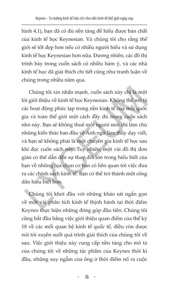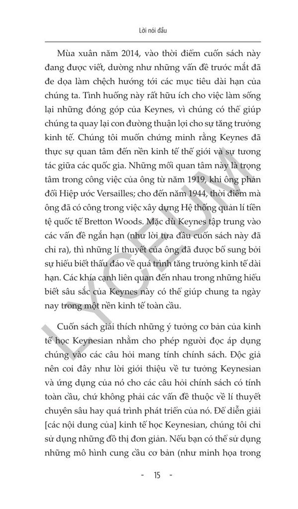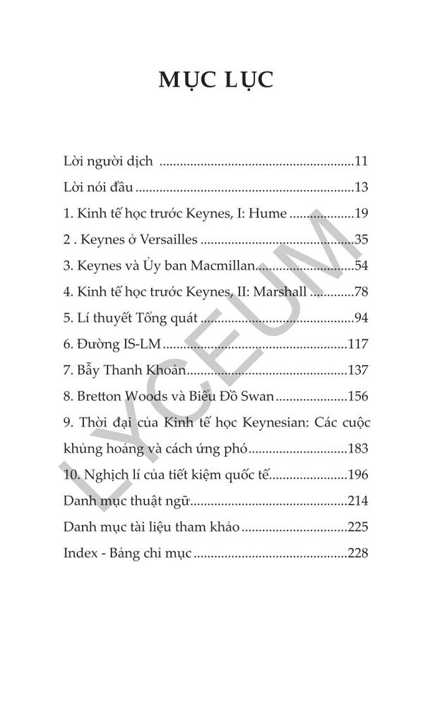 Sách khởi đầu bằng cách trình bày nền kinh tế trước thời Keynes, từ các lý thuyết của Hume đến Marshall, để minh họa những trở ngại mà Keynes phải đối mặt khi xây dựng hệ thống tư tưởng của mình. Qua các chương, độc giả sẽ được làm quen với những khái niệm kinh tế quan trọng như bẫy thanh khoản, biểu đồ IS-LM, và các chính sách tài chính Keynesian, được minh họa bằng các mô hình và biểu đồ dễ hiểu.