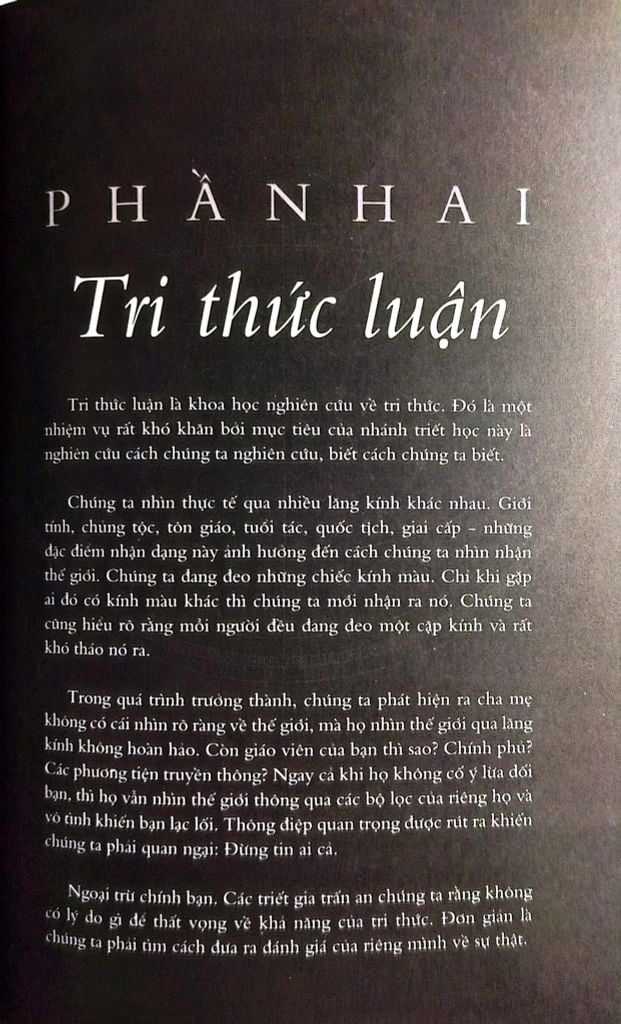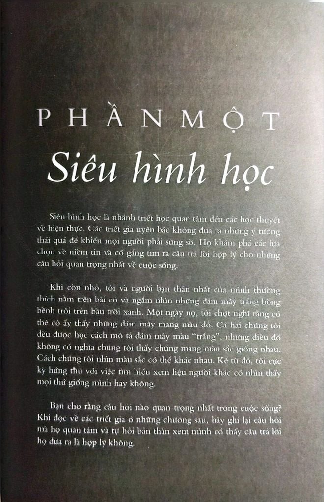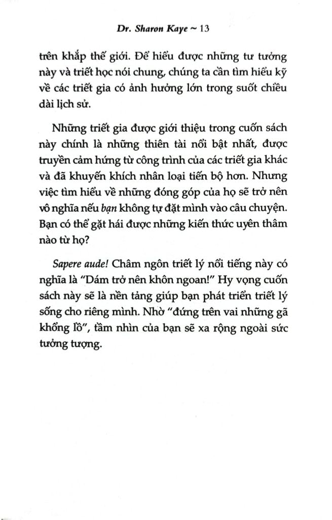 Những triết gia sẽ được giới thiệu trong cuốn sách chính là những người nổi bật nhất, họ là những thiên tài đã phát triển dựa trên công việc của người khác và truyền cảm hứng cho nhân loại tiến bộ hơn. Nhưng việc tìm hiểu về những đóng góp của họ sẽ trở nên vô nghĩa nếu bạn không tự đặt mình vào trong câu chuyện. Bạn có thể gặt hái được những kiến thức uyên thâm nào từ họ? Đức Phật luôn khuyên con người phải tự thắp đuốc lên mà đi trên hành trình tìm ra chân lý cho chính bản thân mình. Bản thân bạn sẽ chính là câu trả lời sau tất cả.