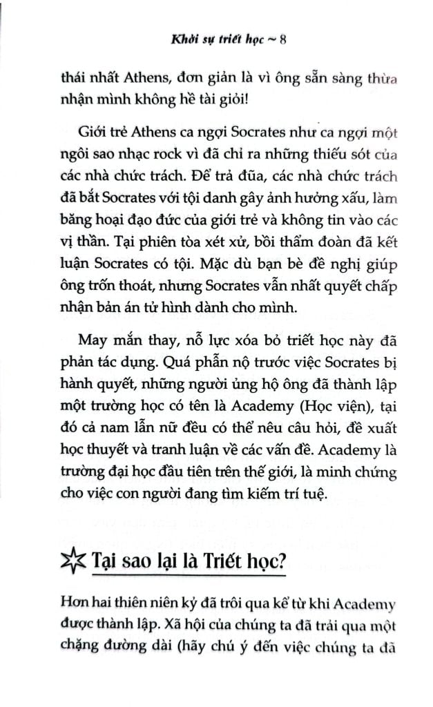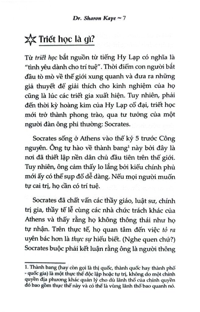 Triết học sinh ra không phải chỉ là câu chuyện của Socrates thành Athens từ thế kỷ thứ IV TCN mà là câu chuyện cho tất cả nhân loại ở mọi thời đại. Từ “triết học” bắt nguồn từ tiếng Hy Lạp có nghĩa là “tình yêu dành cho trí tuệ”. Và cuốn sách “Khởi sự triết học - Từ Athens tới AI” của tác giả Sharon Kaye (giáo sư khoa Triết học tại Đại học John Carroll ở Cleveland) sẽ là người bạn đồng hành cùng bạn trong hành trình tìm ra lời giải cho hàng nghìn câu hỏi để đi đến cái đích trí tuệ mà bạn luôn trăn trở.