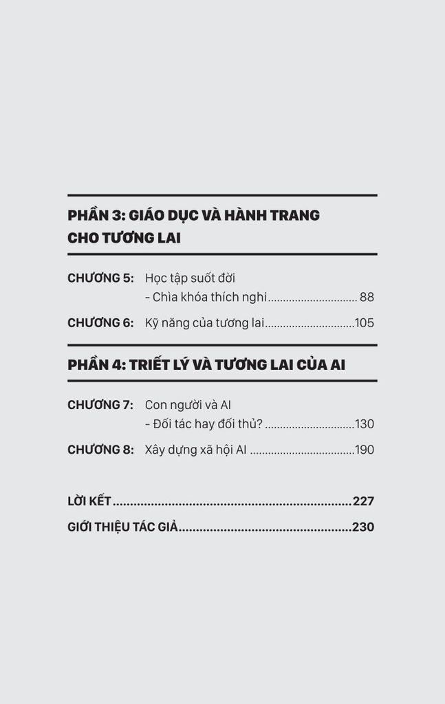 - Cân bằng giữa công nghệ, triết lý và giá trị nhân văn: Không chỉ bàn về công nghệ, Phần 4 mở rộng sang tư duy triết lý với câu hỏi: Con người và AI – Đối tác hay đối thủ? Cuốn sách khẳng định rằng AI mạnh, nhưng trí tuệ nhân sinh vẫn là lợi thế cạnh tranh cốt lõi.