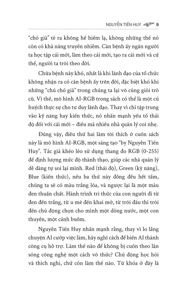 Cái đầu tiên làm tôi thích ở cuốn sách này là cách tác giả mổ xẻ cái tâm thế con người trước làn sóng AI. Nguyễn Tiến Huy không cố gắng vẽ ra một bức tranh viễn tưởng màu mè, cũng không hô hào khẩu hiệu sáo rỗng “chạy đua cùng AI”. Anh đề cập đến AI từ một góc nhìn rất con người: làm chủ hay bị dẫn dắt, chọn một dòng hay để nước trôi.