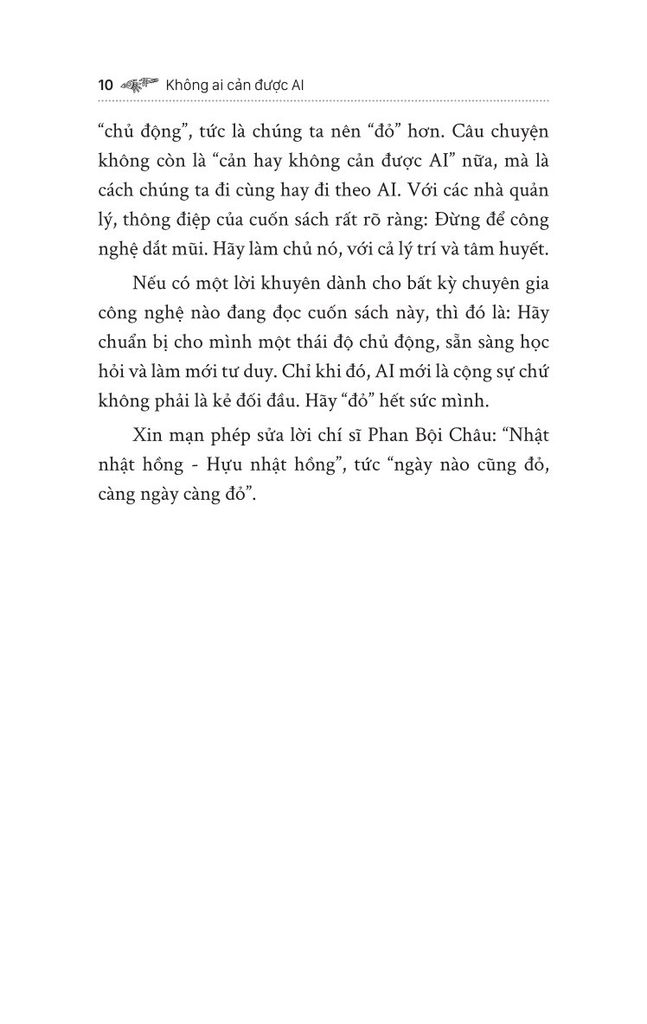 Nếu có một lời khuyên dành cho bất kỳ chuyên gia công nghệ nào đang đọc cuốn sách này, thì đó là: Hãy chuẩn bị cho mình một thái độ chủ động, sẵn sàng học hỏi và làm mới tư duy. Chỉ khi đó, AI mới là cộng sự chứ không phải là kẻ đối đầu. Hãy “đỏ” hết sức mình.