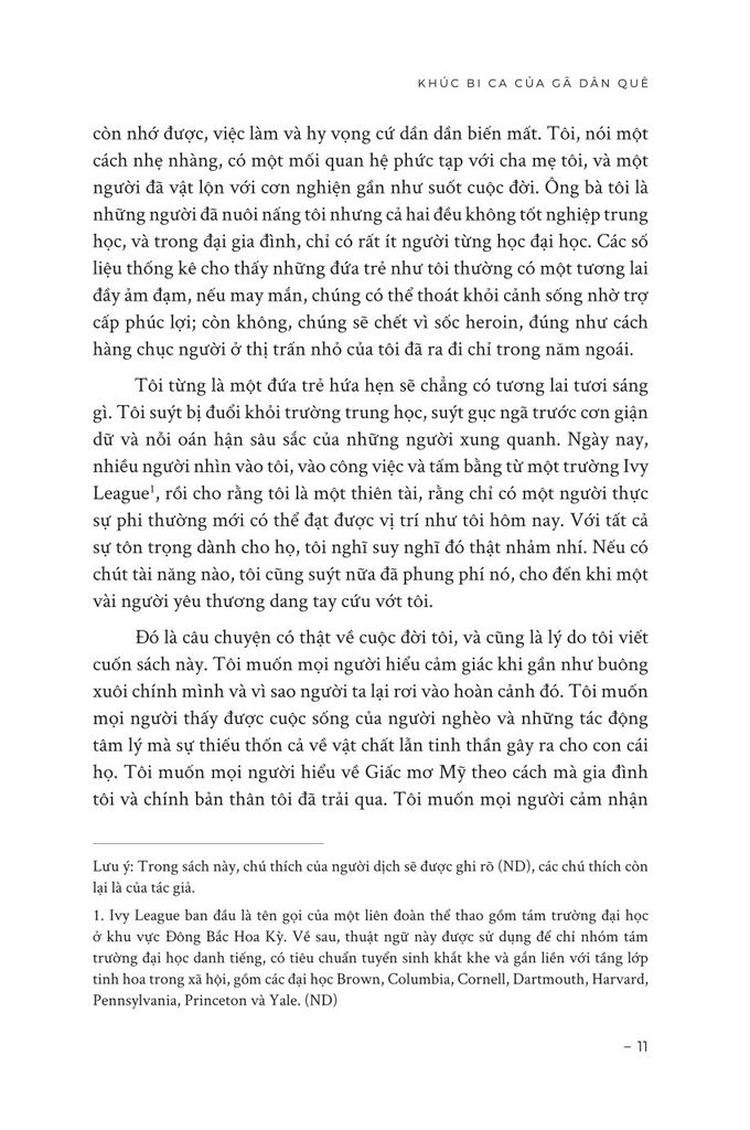 Tâm sự trong cuốn sách, Vance viết: “Tôi từng là một đứa trẻ hứa hẹn chẳng có tương lai tươi sáng gì. Tôi suýt bị đuổi khỏi trường trung học, suýt gục ngã trước cơn giận dữ và nỗi oán hận sâu sắc của những người xung quanh… Đó là câu chuyện có thật về cuộc đời tôi, và cũng là lý do tôi viết cuốn sách này. Tôi muốn mọi người hiểu cảm giác khi gần như buông xuôi chính mình và vì sao người ta lại rơi vào hoàn cảnh đó”.