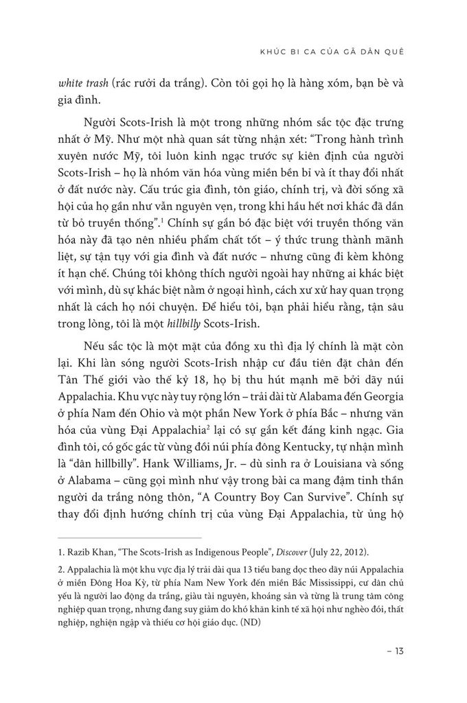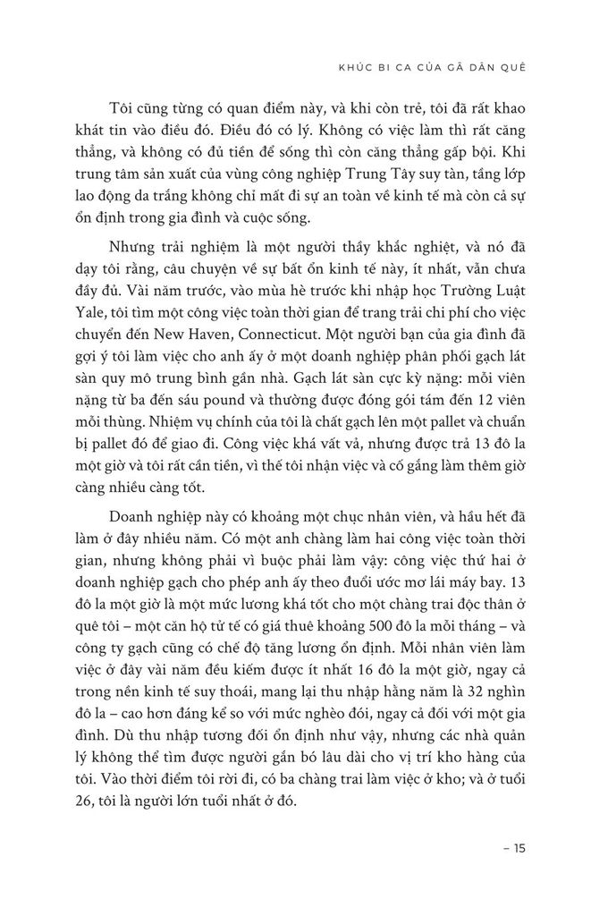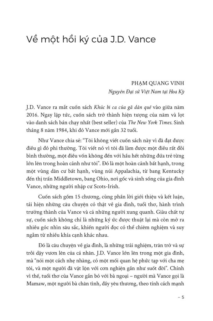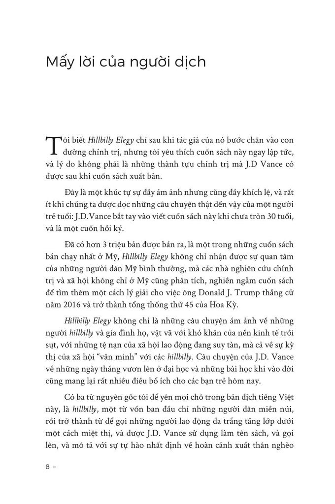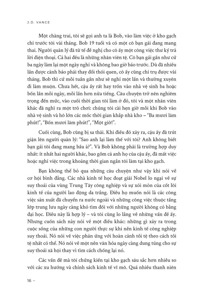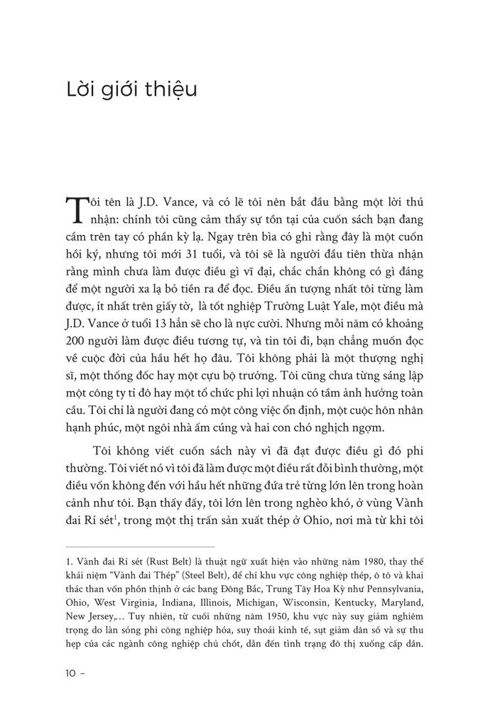 J.D. Vance sinh ra trong một gia đình lao động nghèo thuộc vùng Vành đai Rỉ sét, Vance lớn lên giữa những tổn thương và bất ổn: người mẹ nghiện ngập, những lần chuyển nhà vội vã, bạo lực và cãi vã triền miên. Nhưng bằng cách nào đó, cậu bé ấy đã tìm được lối thoát - gia nhập Thủy quân Lục chiến, theo học Trường Luật Yale và trở thành một luật sư.