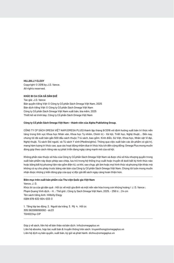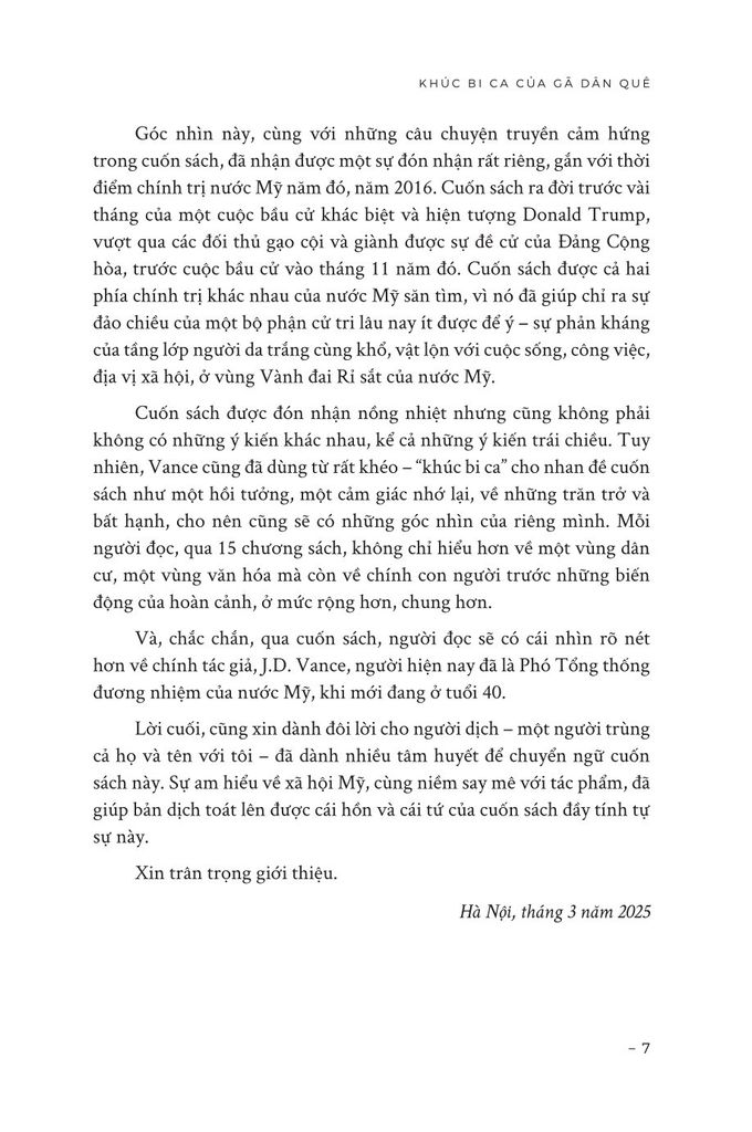 “Khúc bi ca của gã dân quê” là cuốn hồi ký đầu tay của J.D. Vance - Phó Tổng thống Mỹ thứ 50 và là đương nhiệm của Hoa Kỳ. Cuốn sách nhanh chóng gây tiếng vang lớn kể từ khi xuất bản, trở thành bestseller và được xem là một trong những tác phẩm quan trọng giúp lý giải những biến động xã hội và chính trị tại Mỹ đương thời.