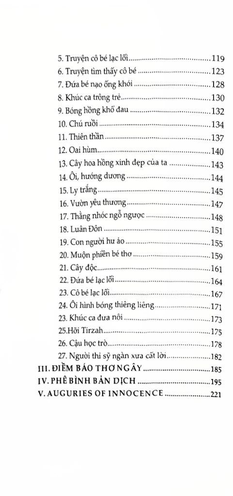 Không chỉ dừng lại ở phần dịch thơ, cuốn sách còn cung cấp phần dẫn luận công phu, làm sáng rõ tiểu sử, phong cách nghệ thuật, cùng những khúc quanh trong đời sống sáng tạo của William Blake - từ thời thơ ấu, cuộc hôn nhân viên mãn với Catherine Boucher, cho đến những năm tháng bị lãng quên và sự phục hưng muộn màng sau khi ông mất.