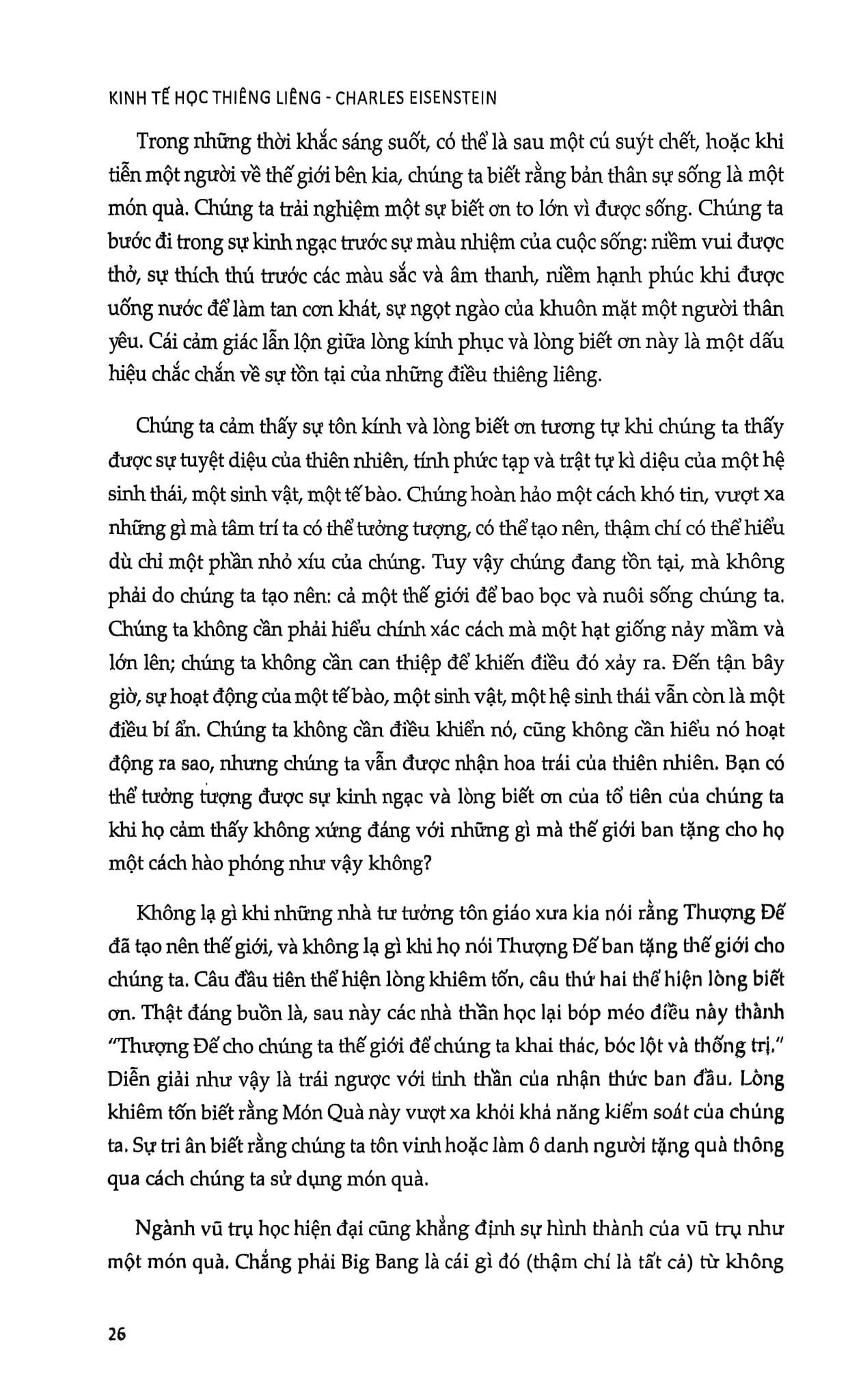 Kinh tế học thiêng liêng khảo sát một lịch sử tiền tệ từ những nền kinh tế quà tặng thời cổ đại tới chủ nghĩa tư bản hiện đại, qua đó diễn trình cách hệ thống tiền tệ đã khiến xã hội loài người trở nên cạnh tranh, ích kỷ, bị chia rẽ, tham lam vô độ, với ước ao phát triển vô tận. Ngày nay, những xu hướng này đã đạt đến cực điểm và bắt đầu những sự dấu hiệu của sự sụp đổ, đồng thời hé lộ những mầm mống của một nền kinh tế mới mà trong đó các cá nhân kết nối tốt hơn, bền vững hơn và hòa hợp với hệ sinh thái hơn. Kinh tế học thiêng liêng còn bàn về cách hệ thống tiền tệ cần phải thay đổi – và đang thay đổi. Một loạt các phân tích liên ngành giữa lý thuyết kinh tế, nghiên cứu chính sách và khảo sát thực tiễn là nền tảng cho những khái niệm mới đi ngược lại niềm tin kinh tế đương thời, bao gồm “tiền tệ có lãi suất âm”, “nội tệ”, “kinh tế dựa trên tài nguyên”, “kinh tế quà tặng” và “sự phục hồi của đồng tiền”… Tác giả Charles Eisenstein cũng xem xét các khó khăn mà những cá nhân quân tâm đến “sinh kế đúng đắn” và lối sống bền vững trong một thế giới dường như bị tiền bạc cai trị. Đồng thời ông cũng đưa ra gợi ý về cách triển khai mô hình “Kinh tế học thiêng liêng” trên thực tế.