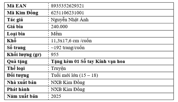 SKU: 8935352629321 Tình trạng: Còn hàng NXB/Phát hành: Kim Đồng Tác giả: Nguyễn Nhật Ánh