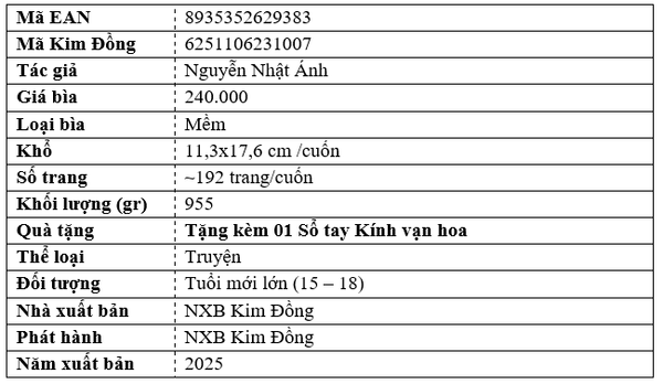 SKU: 8935352629383 Tình trạng: Còn hàng NXB/Phát hành: Kim Đồng Tác giả: Nguyễn Nhật Ánh