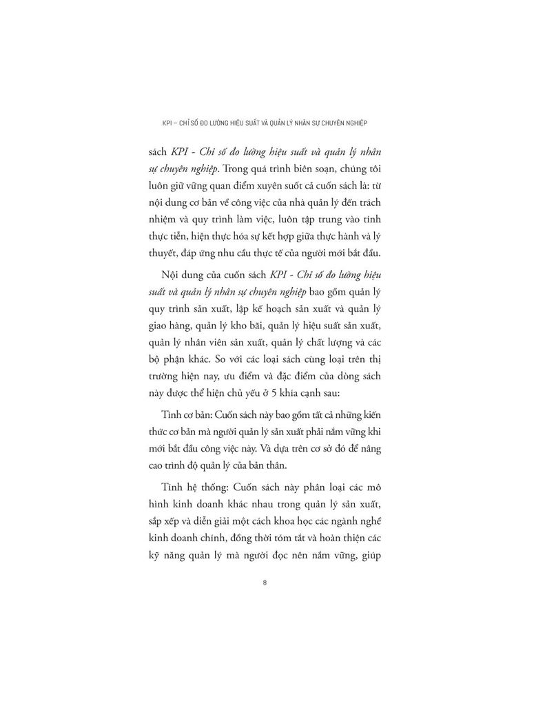 KPI – Chỉ số đo lường hiệu suất và quản lý nhân sự chuyên nghiệp là cuốn cẩm nang thực hành dành riêng cho các nhà quản lý sản xuất và nhân sự trong môi trường doanh nghiệp hiện đại. Thay vì sa đà vào lý thuyết, tác phẩm này tập trung giải quyết bài toán cốt lõi: Làm thế nào để xây dựng và vận hành một hệ thống KPI minh bạch, khoa học và có tính ứng dụng cao trong thực tiễn.