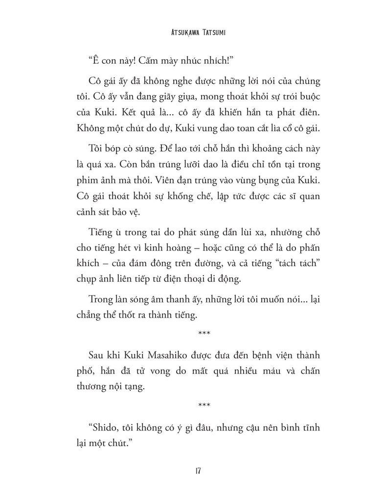 ATSUKAWA TATSUMI là một tiểu thuyết gia trinh thám người Nhật, sinh năm 1994 tại Tokyo. Anh tốt nghiệp Đại học Tokyo và ra mắt vào năm 2017 với tác phẩm "Meitantei wa uso wo tsukanai" (tạm dịch: Thám tử thiên tài không nói dối), một phần của một dự án tìm kiếm tài năng văn học (KAPPA TWO). Anh là một trong những tác giả trẻ được chú ý với các tác phẩm nhận được đánh giá cao và xuất hiện trong danh sách 本格推理小説 Best 10 (Top 10 tiểu thuyết trinh thám chính thống). Atsukawa nổi tiếng với những tiểu thuyết trinh thám phong cách cổ điển, thường khai thác các vụ án phòng kín và cốt truyện phức tạp.