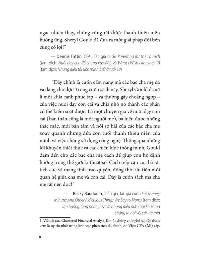 Cuốn sách sẽ cung cấp cho bạn phương pháp phù hợp để có thể nói chuyện với con một cách cởi mở về công nghệ cũng như những điều bạn cần biết và hiểu từ quan điểm của con - những đứa trẻ ở độ tuổi thanh thiếu niên - về thế giới chúng đang sống ngày nay. Từ đó, xây dựng mối liên kết bền chặt với con thay vì tạo ra các cuộc xung đột và tranh cãi về quyền lực.