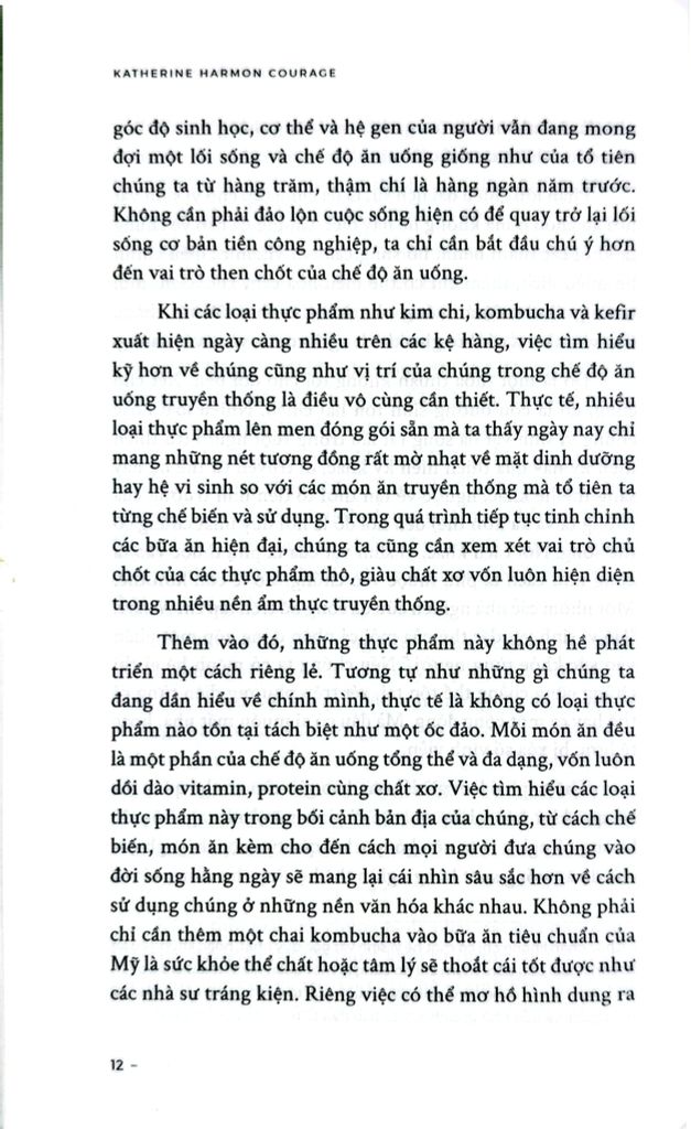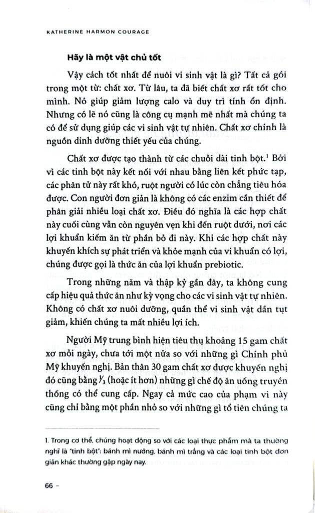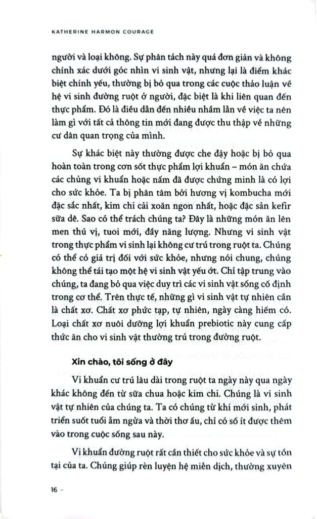 Xuyên suốt các chương, Katherine Harmon Courage làm rõ bản chất của các vi sinh vật trong ruột, những nhóm vi khuẩn chủ đạo và mối liên hệ giữa hệ vi sinh với chế độ ăn trong lịch sử tiến hóa của loài người. Từ đó, cuốn sách đi đến một luận điểm then chốt: việc nuôi dưỡng hệ vi sinh không bắt đầu từ phòng thí nghiệm hay các sản phẩm công nghiệp hiện đại, mà từ những truyền thống ẩm thực cổ xưa. Các thực phẩm giàu chất xơ, tiền sinh học và đặc biệt là thực phẩm lên men đã âm thầm nuôi dưỡng sức khỏe con người qua nhiều thế hệ.