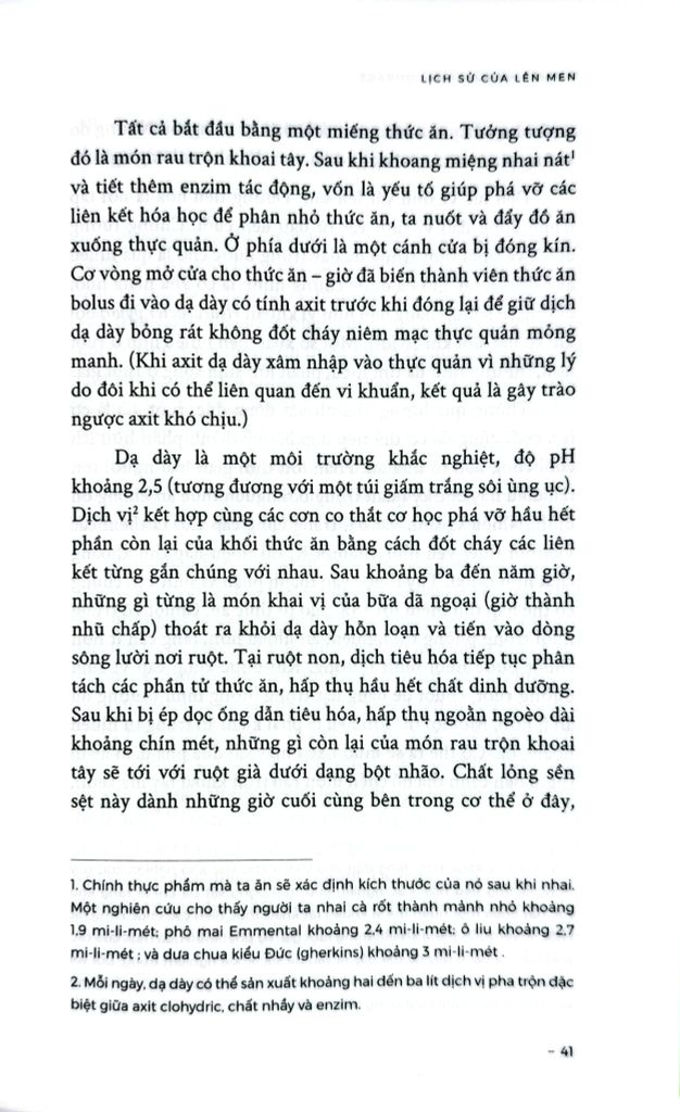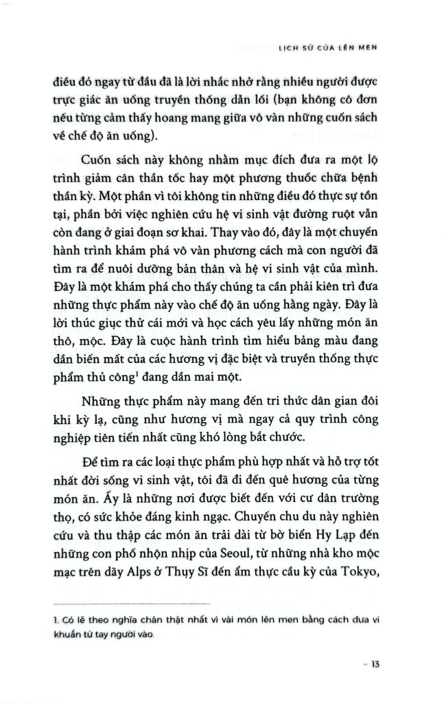 Một điểm nổi bật của cuốn sách là chuyến du hành qua các nền văn hóa lên men trên khắp thế giới: từ sữa chua Hy Lạp, kefir vùng Caucasus, kim chi Hàn Quốc, dưa cải chua châu Âu, đến miso, natto, kombucha, ca cao, nước mắm và nem chua. Trong cách kể của tác giả, thực phẩm lên men không hiện lên như một xu hướng thời thượng, mà như kết quả của những lựa chọn sinh tồn thực tế: bảo quản thực phẩm, thích nghi với môi trường và duy trì sự sống. Song song với các câu chuyện văn hóa, cuốn sách còn chia sẻ những công thức đơn giản, giúp người đọc có thể tự thực hành việc nuôi dưỡng hệ vi sinh trong đời sống hằng ngày.