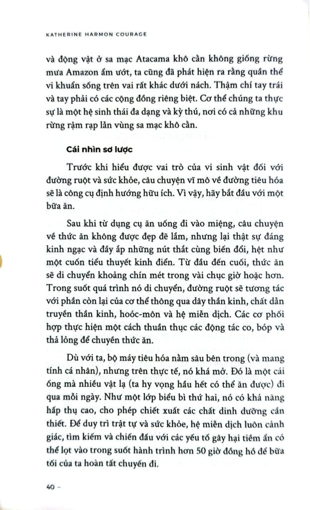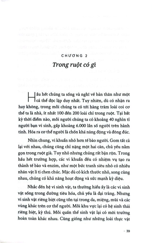 Với lối viết kết hợp giữa báo chí khoa học, du ký ẩm thực và nghiên cứu văn hóa, tác giả dẫn người đọc bước vào hành trình khám phá hệ vi sinh đường ruột như một hệ sinh thái sống động, phức tạp và có ảnh hưởng sâu rộng đến đời sống con người. Ngay từ những trang đầu, cuốn sách giới thiệu khái niệm hệ vi sinh và cho thấy vì sao khoa học hiện đại đang buộc chúng ta nhìn lại vai trò thiết yếu của vi khuẩn, không chỉ trong tiêu hóa mà còn đối với miễn dịch, tâm trạng và sức khỏe lâu dài.
