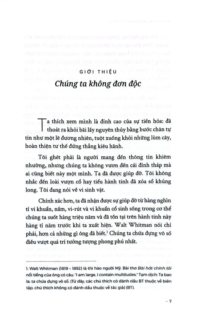 “Kể từ thời Galileo, chúng ta đã phải trải qua một hành trình dài đầy gian nan để thoát khỏi tư tưởng lấy con người làm trung tâm của vũ trụ. Giờ đây, hệ vi sinh vật lại một lần nữa đưa ra lời nhắc nhở đầy kinh ngạc rằng: chúng ta không phải là chủ nhân của vũ trụ, thậm chí cũng chẳng thực sự làm chủ được chính cơ thể của mình.”