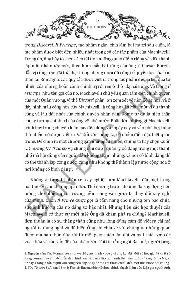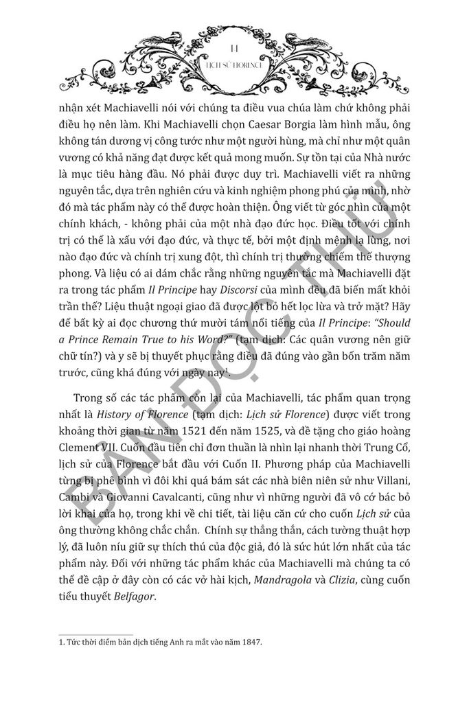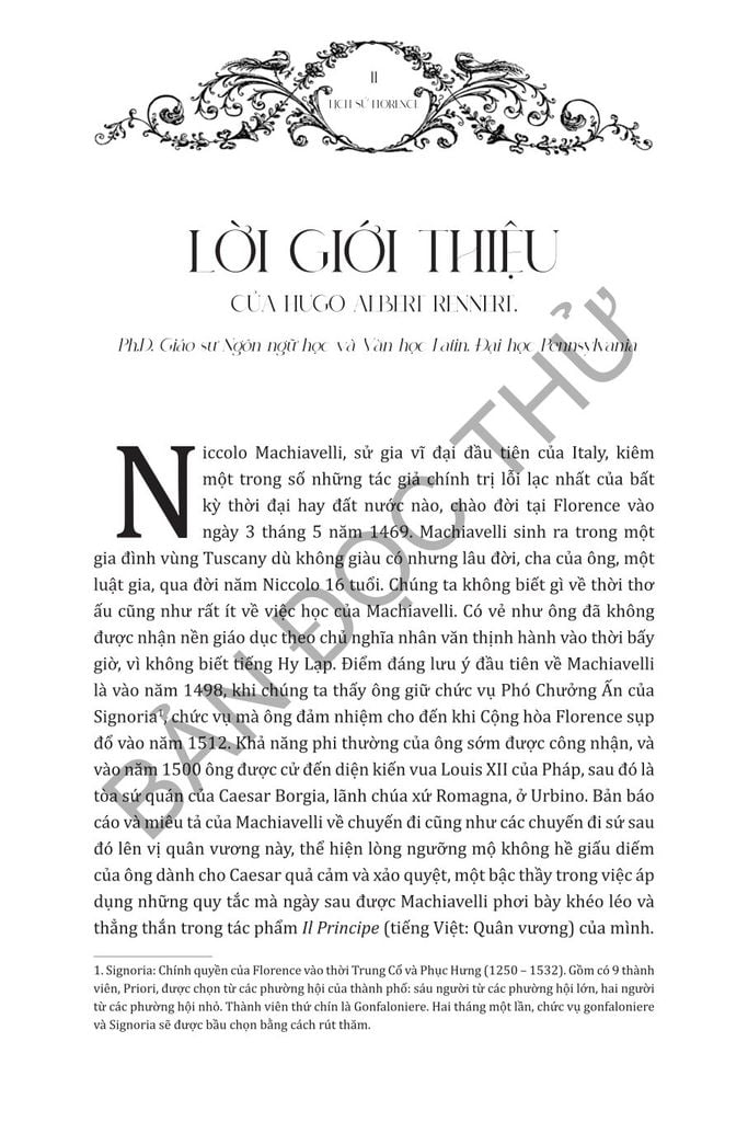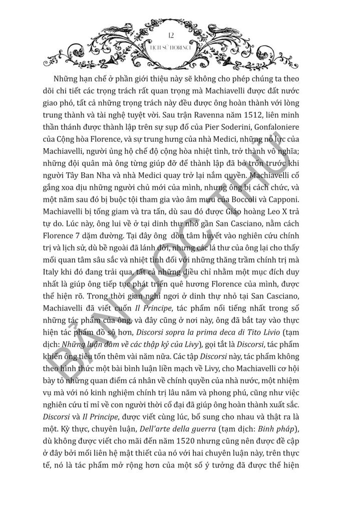 Về bản chất, Lịch Sử Florence không chỉ là biên niên sử về quá khứ của Florence mà còn phản ánh sự hiểu biết sâu sắc của Machiavelli về động lực chính trị và cách tiếp cận tiên phong của ông trong phân tích lịch sử. Cuốn sách cung cấp những hiểu biết sâu sắc vô giá cho bất kỳ ai quan tâm đến lịch sử Florence, chính trị thời Phục Hưng hoặc rộng hơn là triết học của Machiavelli.
