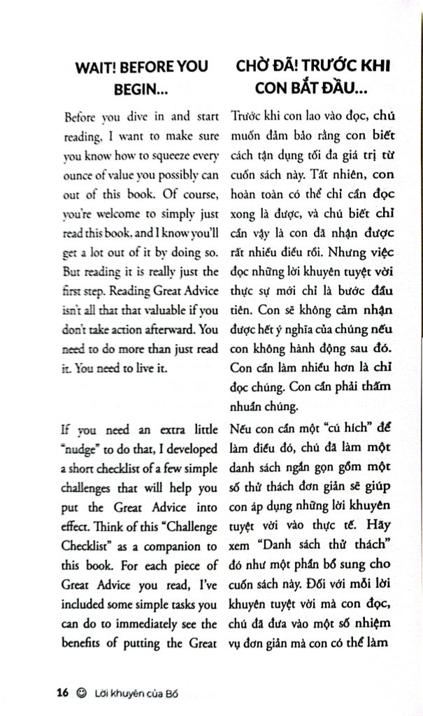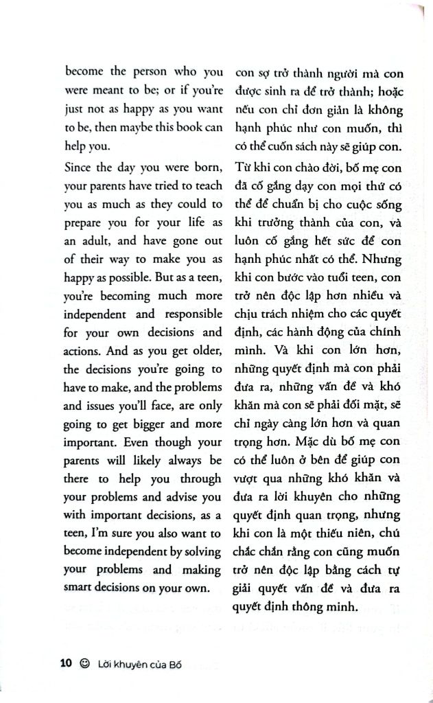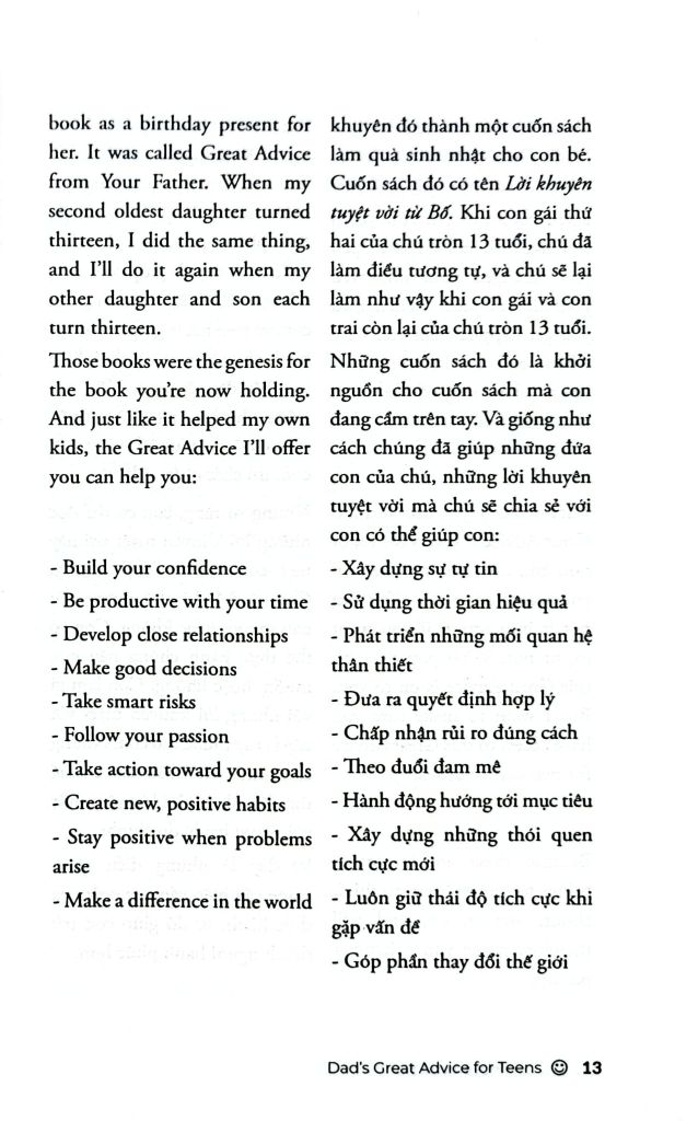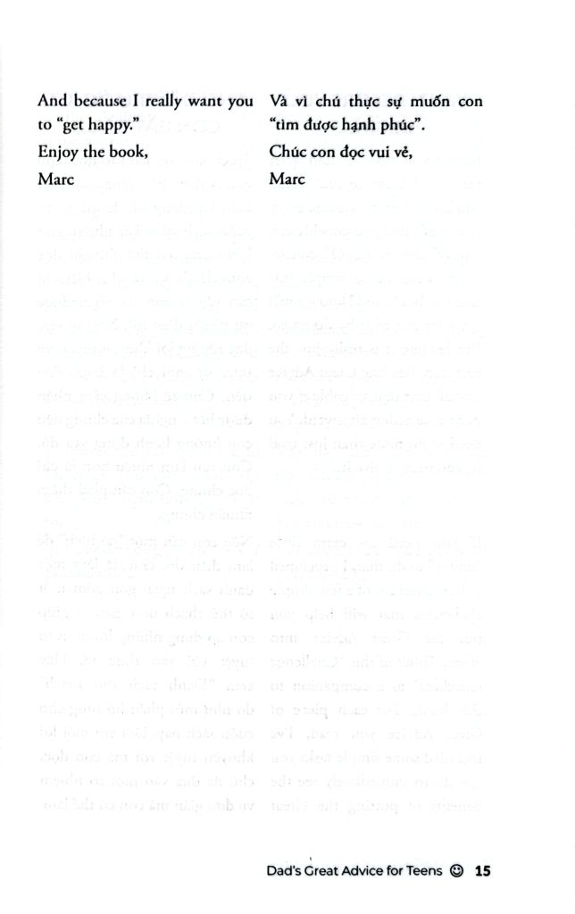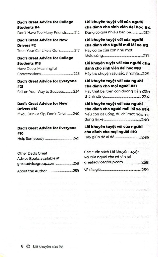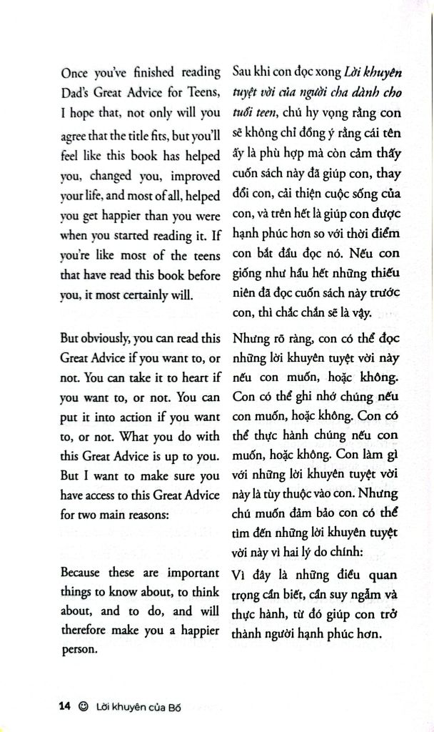 Sách thuộc dòng Wellspring – sách song ngữ Anh – Việt, được thiết kế để bạn: – Học tiếng Anh một cách tự nhiên qua từng trang sách – Mở rộng vốn từ vựng, làm giàu cách diễn đạt trong ngữ cảnh đời thường – Tăng phản xạ đọc hiểu mà không cần từ điển – Cảm nhận được sự khác biệt tinh tế giữa hai ngôn ngữ và hai nền văn hóa – Vừa học, vừa nuôi dưỡng cảm xúc, tư duy và lòng trắc ẩn Lời khuyên của Bố là một lựa chọn lý tưởng cho những ai muốn học tiếng Anh hiệu quả, đồng thời tìm thấy sự an ủi nhẹ nhàng trong hành trình trưởng thành của chính mình.