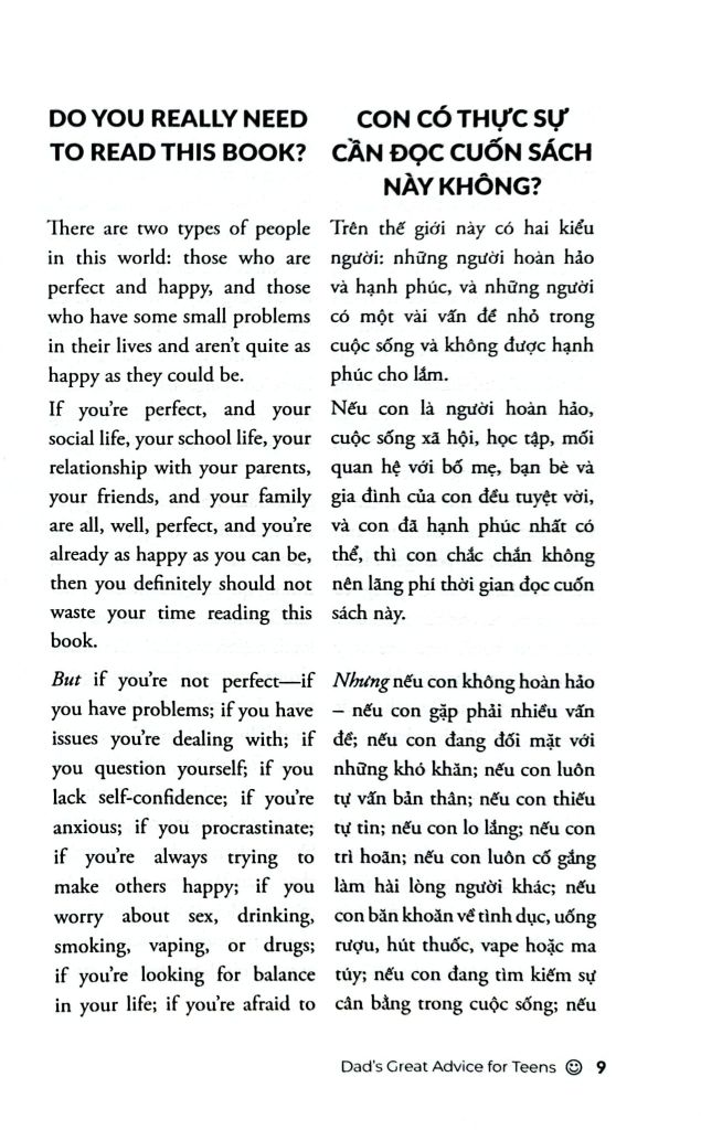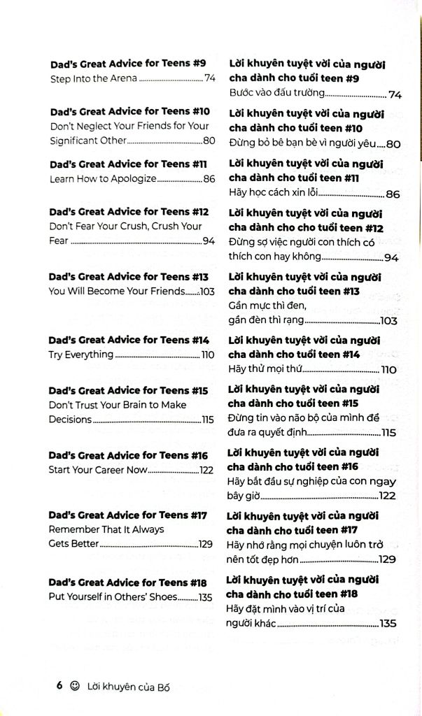 Lời Khuyên Của Bố của Marc Fienberg là một cuốn sách dễ đọc, dễ áp dụng và quan trọng nhất – nó giúp cha mẹ không cảm thấy đơn độc khi con bước vào tuổi teen.