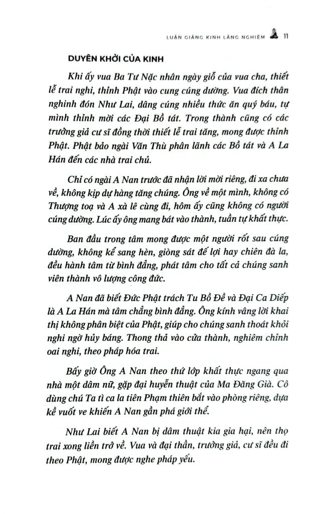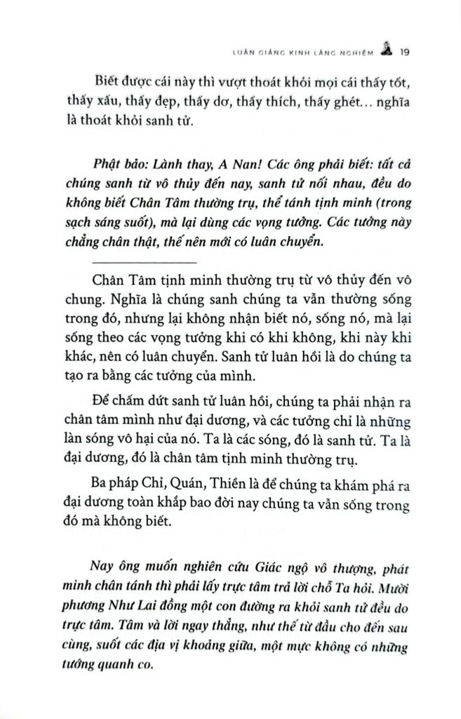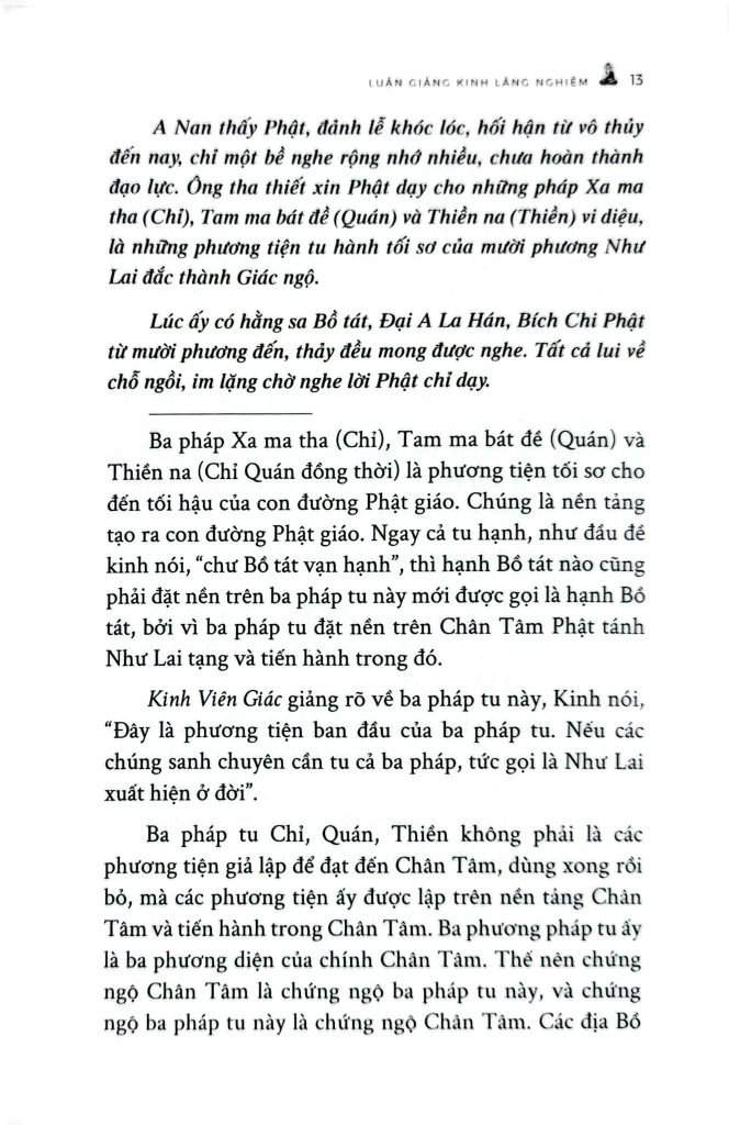 Với tinh thần đó, “Luận giảng Kinh Lăng Nghiêm” được biên soạn nhằm hỗ trợ người đọc tiếp cận bộ kinh trọng yếu này một cách hệ thống và rõ ràng hơn. Tác giả trình bày và giải thích cặn kẽ theo từng ý, từng phân đoạn, giúp người học nắm vững mạch nghĩa của kinh, hiểu đúng nội dung cốt lõi và có thể vận dụng vào quá trình tu tập. Với văn phong chuẩn mực và định hướng thực hành, cuốn sách không chỉ là tài liệu tham khảo có giá trị, mà còn là người bạn đồng hành, góp phần khuyến tấn hành giả tinh tấn trên con đường học và hành theo giáo pháp Đại thừa.