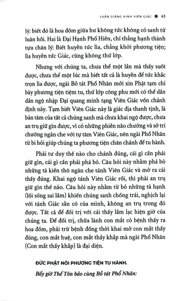 “Luận giảng Kinh Viên Giác” được biên soạn nhằm hỗ trợ người đọc tiếp cận kinh văn một cách hệ thống và đúng nghĩa. Tác giả giải thích cặn kẽ theo từng ý, từng phân đoạn, giúp làm rõ mạch lý, thuật ngữ và trọng điểm tu tập, từ đó góp phần nâng đỡ người đọc trong quá trình học và hành. Đây là một tài liệu tham khảo có giá trị, đồng thời là người bạn đồng hành hữu ích cho những ai mong muốn bước vào con đường tu tập Đại thừa với thái độ nghiêm cẩn và tinh tấn.