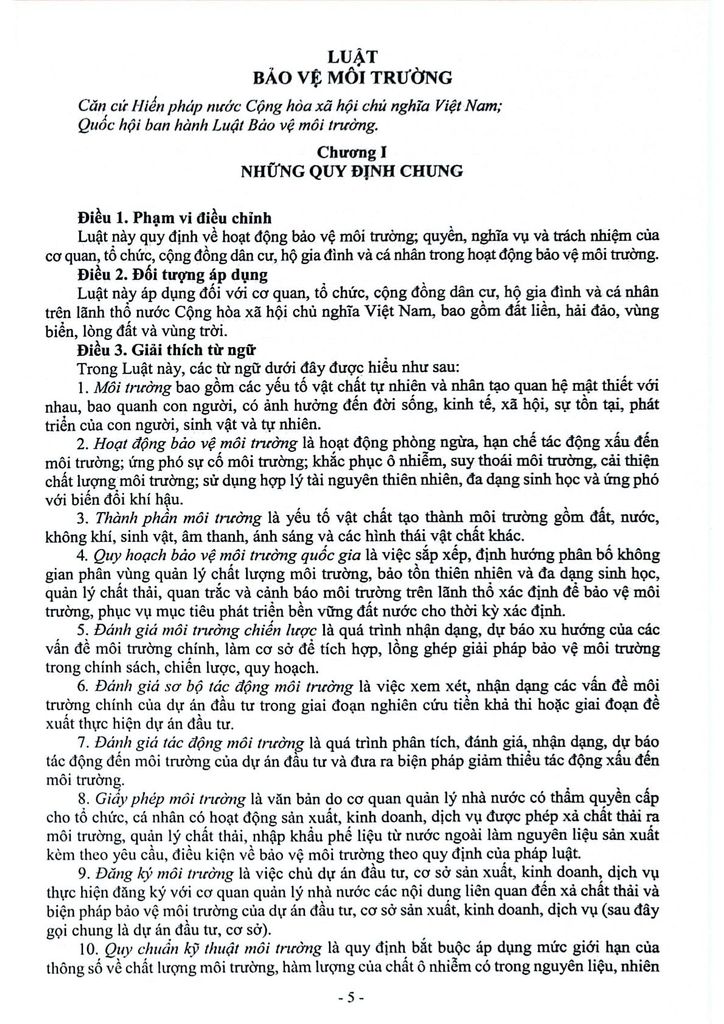 Luật này quy định về hoạt động bảo vệ môi trường, quyền, nghĩa vụ và trách nhiệm của cơ quan, tổ chức, cộng đồng dân cư, hộ gia đình và cá nhân trong hoạt động bảo vệ môi trường