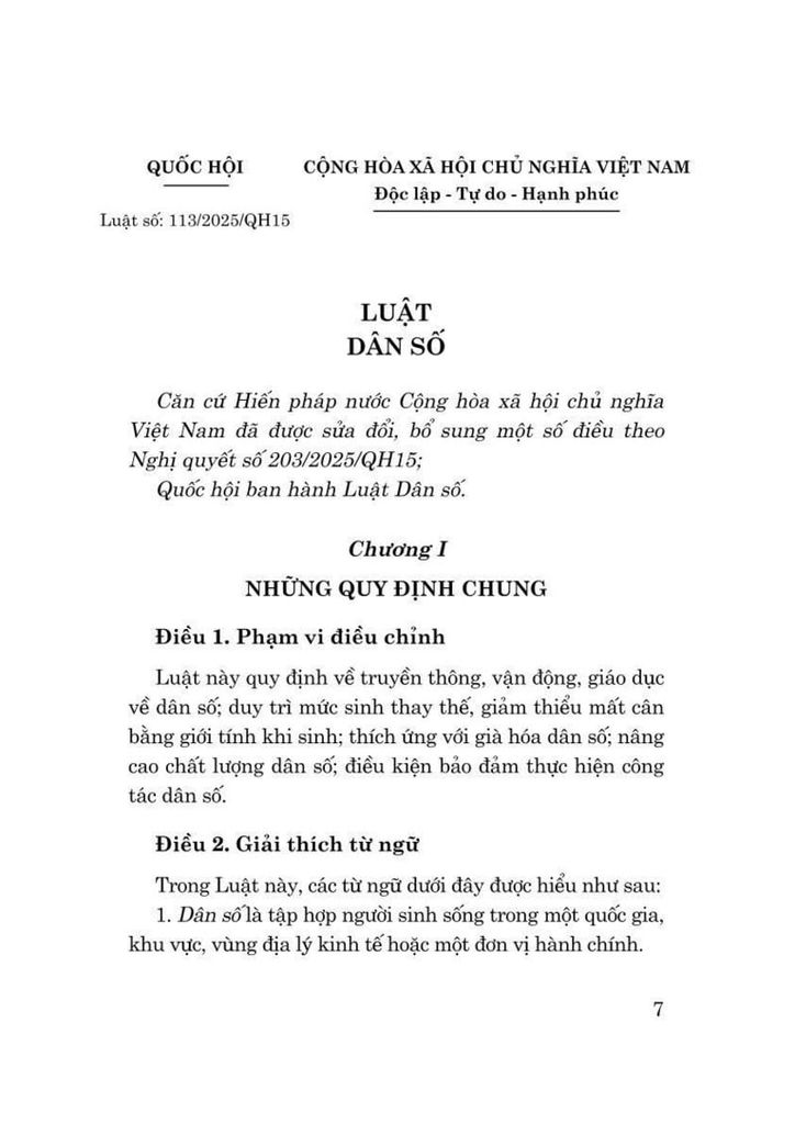 Luật số 113/2025/QH15 của Quốc hội: Luật Dân số. Số ký hiệu, 113/2025/QH15. Ngày ban hành, 10-12-2025. Ngày có hiệu lực, 01-07-2026