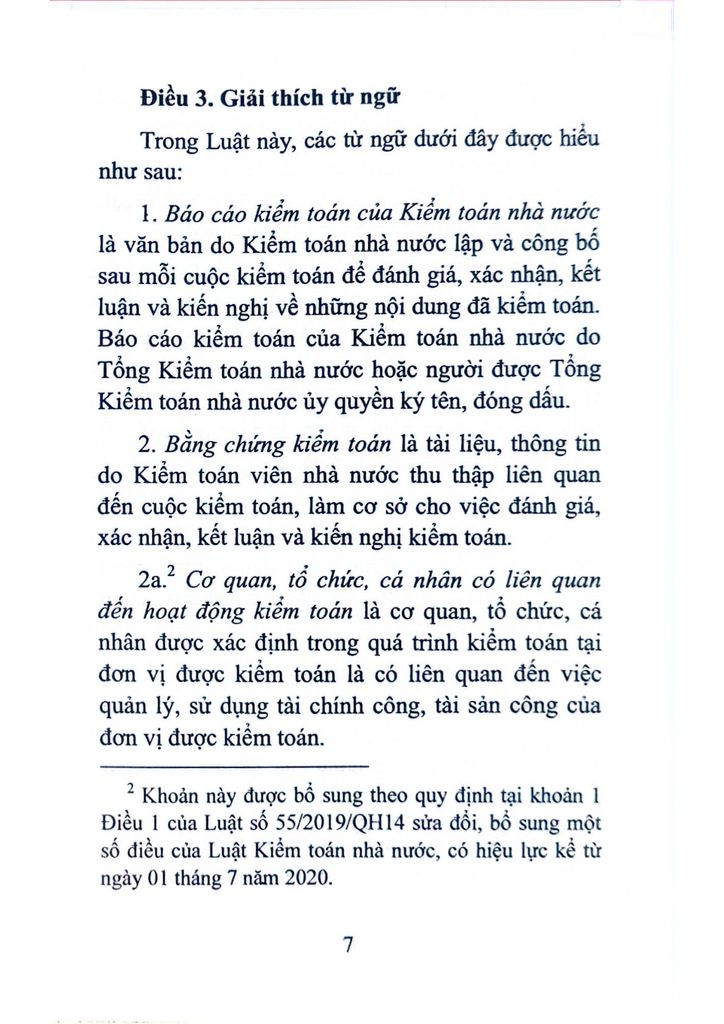 - Luật số 55/2019/QH14 ngày 26 tháng 11 năm 2019 của Quốc hội sửa đổi, bổ sung một số điều của Luật kiểm toán Nhà nước, có hiệu lực kể từ ngày 01 tháng 07 năm 2020