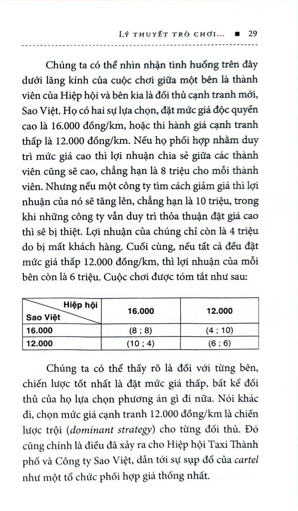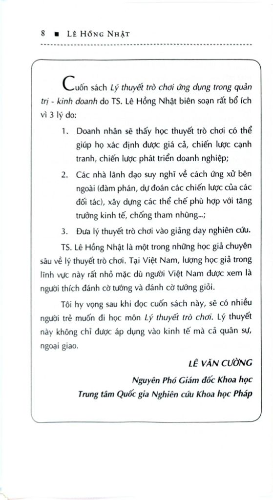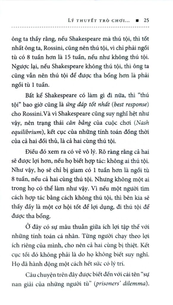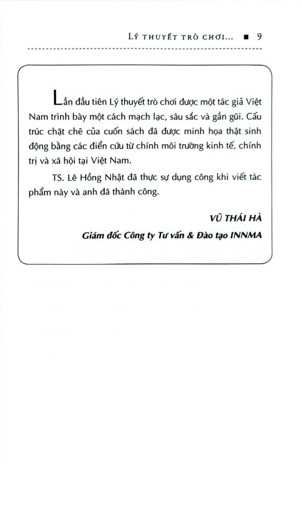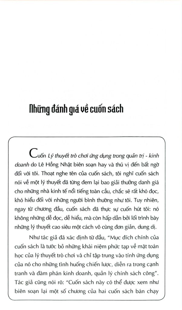 Không dùng những mô hình toán học rối rắm, không dùng những thuật ngữ chuyên môn phức tạp, chỉ bằng một cách diễn giải đầy trí tuệ mà thư thái, nhẹ nhàng, tác giả đã dẫn dắt người đọc đến với một lý thuyết thật hay, truyền đạt cho người đọc những tư tưởng, nội dung cốt lõi của lý thuyết đó, giúp người đọc nắm được vấn đề và cảm nhận được lý thuyết này có thể ứng dụng rộng rãi đến nhường nào trong công việc và cuộc sống của họ. Đặc biệt, những câu chuyện hoặc tình huống giả định được chọn lọc từ nhiều nơi, nhiều bối cảnh khác nhau và đưa vào các chương của cuốn sách thật sự rất hữu ích: chúng vừa minh họa rất thuyết phục cho lý thuyết trò chơi, vừa là những bài học thực tiễn rất phong phú và gần gũi đối với người đọc Việt Nam.