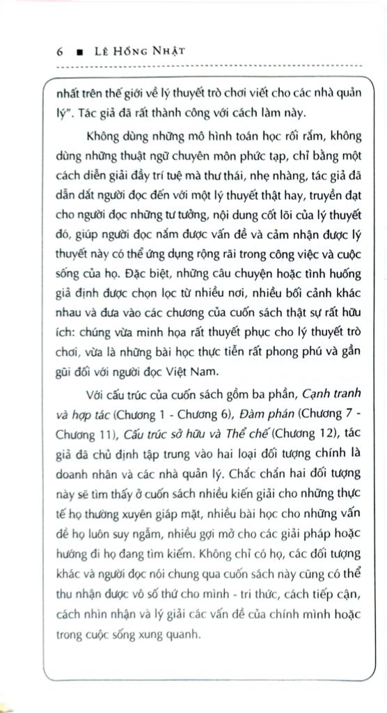 Cấu trúc cuốn sách Lý Thuyết Trò Chơi Và Ứng Dụng Trong Quản Trị Kinh Doanh gồm ba phần: Cạnh tranh và hợp tác (Chương 1 - Chương 6), Đàm phán (Chương 7 - Chương 11), Cấu trúc sở hữu và Thể chế (Chương 12 -Chương 16), tác giả đã chủ định tập trung vào hai loại đối tượng chính là doanh nhân và các nhà quản lý. Chắc chắn hai đối tượng này sẽ tìm thấy ở cuốn sách nhiều kiến giải cho những thực tế họ thường xuyên giáp mặt, nhiều bài học cho những vấn đề họ luôn suy ngẫm, nhiều gợi mở cho các giải pháp hoặc hướng đi họ đang tìm kiếm. Không chỉ có họ, các đối tượng khác và người đọc nói chung qua cuốn sách này cũng có thể thu nhận được vô số thứ cho mình - tri thức, cách tiếp cận, cách nhìn nhận và lý giải các vấn đề của chính mình hoặc trong cuộc sống xung quanh.