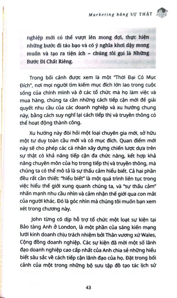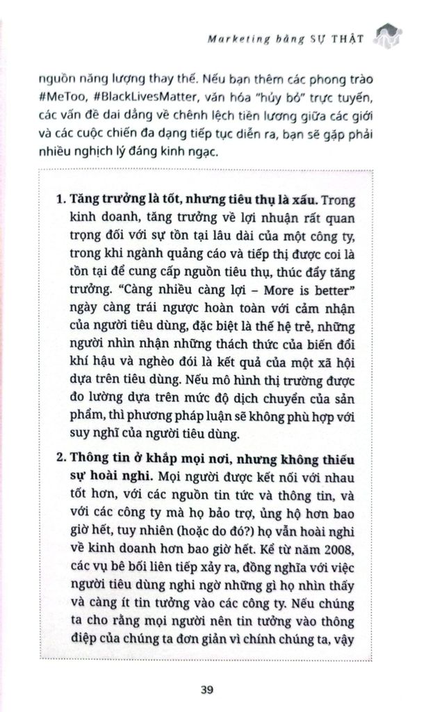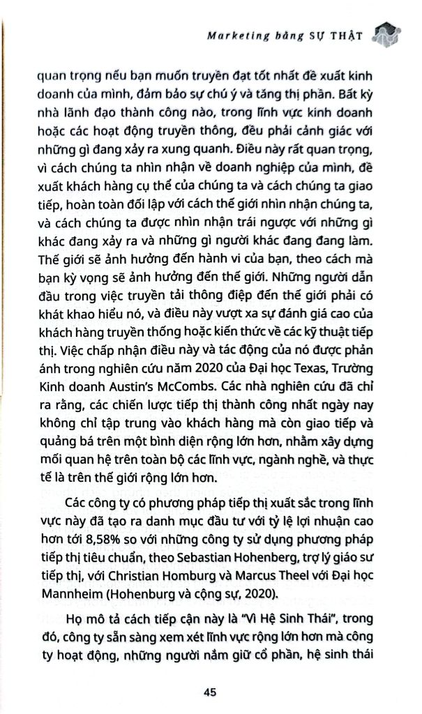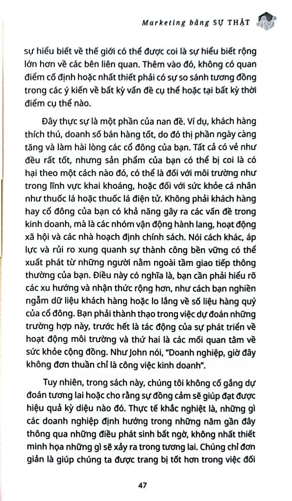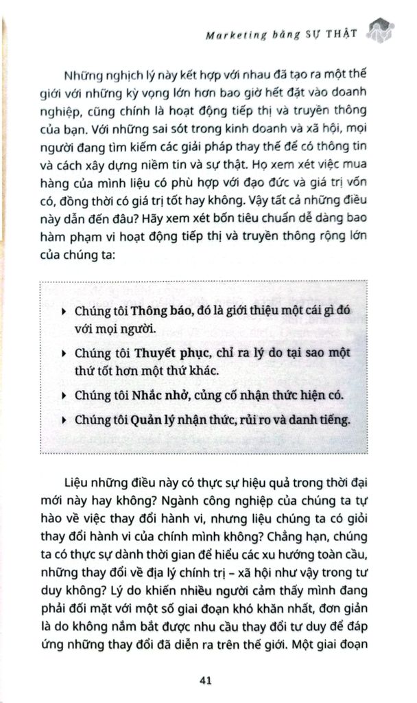 MARKETING BẰNG SỰ THẬT là cuốn cẩm nang dành cho các giám đốc điều hành muốn biết cách truyền đạt hành động và mục đích rộng lớn hơn cho các bên liên quan với thế giới bên ngoài, kể cả trong những thời điểm không chắc chắn và khó khăn như hiện tại.