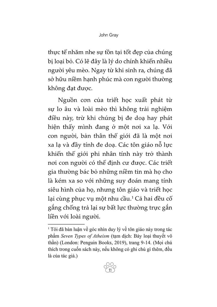 Sách "Mèo Và Triết Lý Nhân Sinh" của John Gray so sánh cuộc sống của mèo và con người, mèo sống tự nhiên và hạnh phúc, trong khi con người lại mải mê tìm kiếm hạnh phúc và sống trong lo âu và mèo dạy ta về sự đơn giản từ đó giúp chúng ta nhận ra những lầm lạc trong hành trình tìm kiếm hạnh phúc của chính mình.