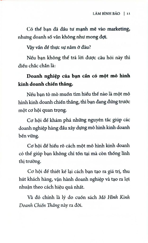 Với cuốn sách Mô Hình Kinh Doanh Chiến Thắng, Thạc sĩ Lâm Bình Bảo mong muốn chia sẻ những kiến thức, kinh nghiệm và công cụ thiết kế mô hình kinh doanh thực tiễn, giúp các doanh nghiệp Việt Nam xây dựng lợi thế cạnh tranh bền vững, thích nghi và chiến thắng trong môi trường kinh doanh đầy biến động.