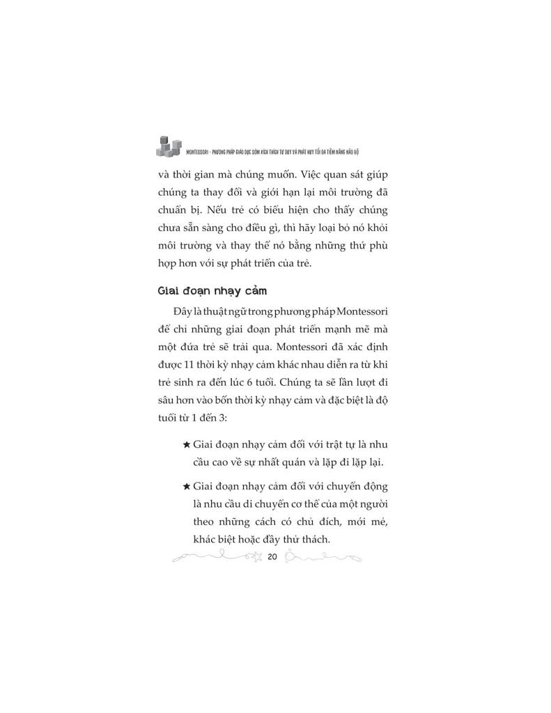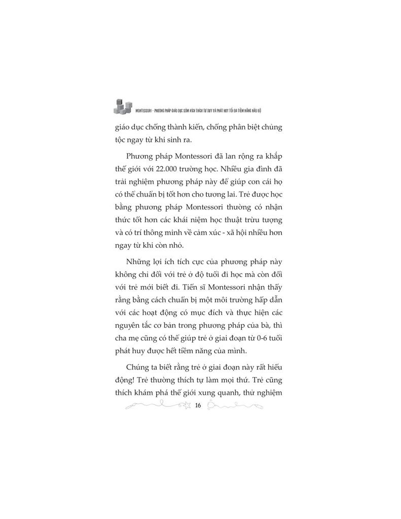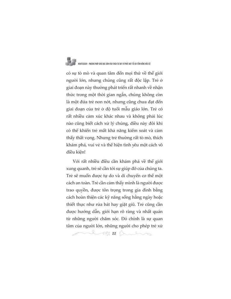 Dựa trên phương pháp Montessori kinh điển, cuốn sách không tiếp cận giáo dục sớm như một cuộc “dạy trước, học sớm”, mà như một hành trình đồng hành có ý thức, nơi người lớn học cách quan sát, chuẩn bị môi trường và trao cho trẻ quyền được phát triển đúng với tiềm năng bẩm sinh của mình.