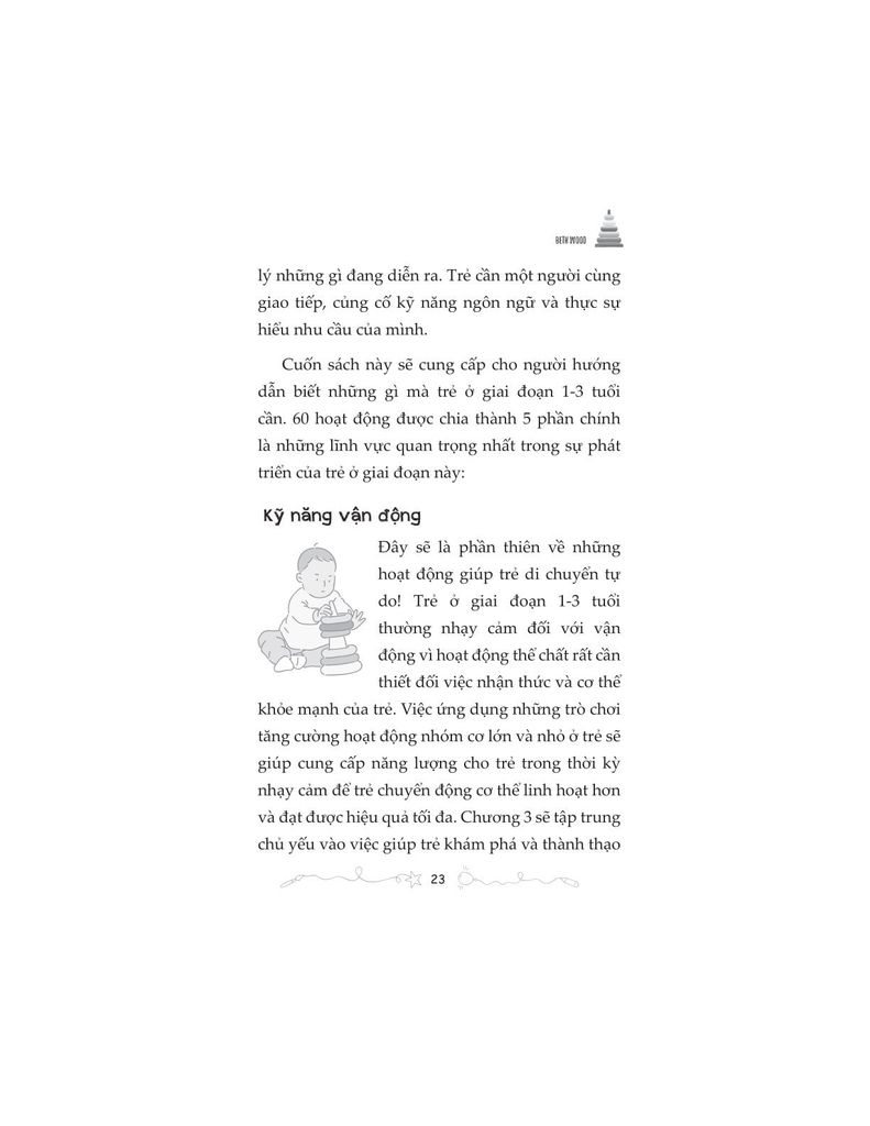 Cuốn sách tập hợp hệ thống kiến thức nền tảng và các hoạt động thực tiễn dành cho trẻ từ 0–6 tuổi, được trình bày rõ ràng, khoa học và dễ áp dụng tại gia đình cũng như môi trường giáo dục mầm non. Từ vận động, nghệ thuật, giác quan đến đời sống thực hành, mỗi nội dung đều hướng tới mục tiêu phát triển toàn diện: thể chất, trí tuệ, cảm xúc, tính tự lập.