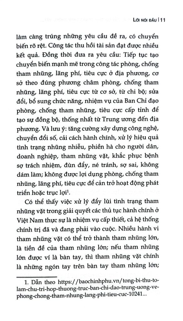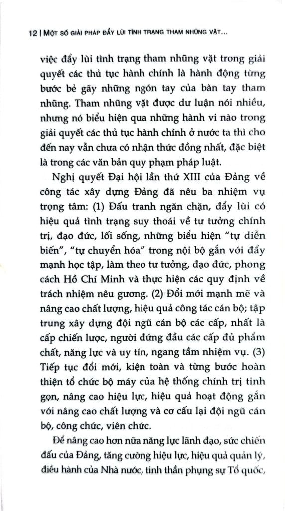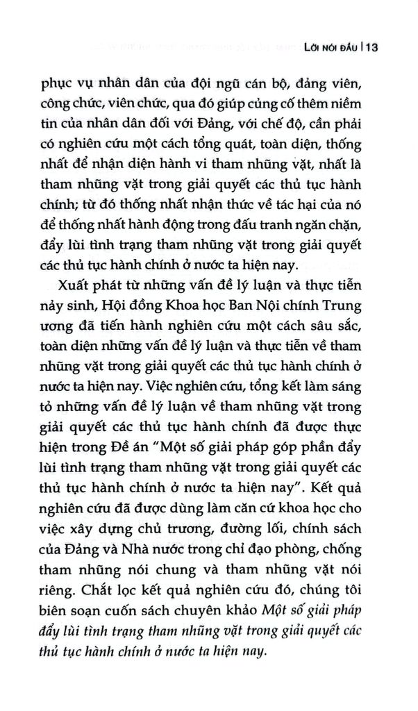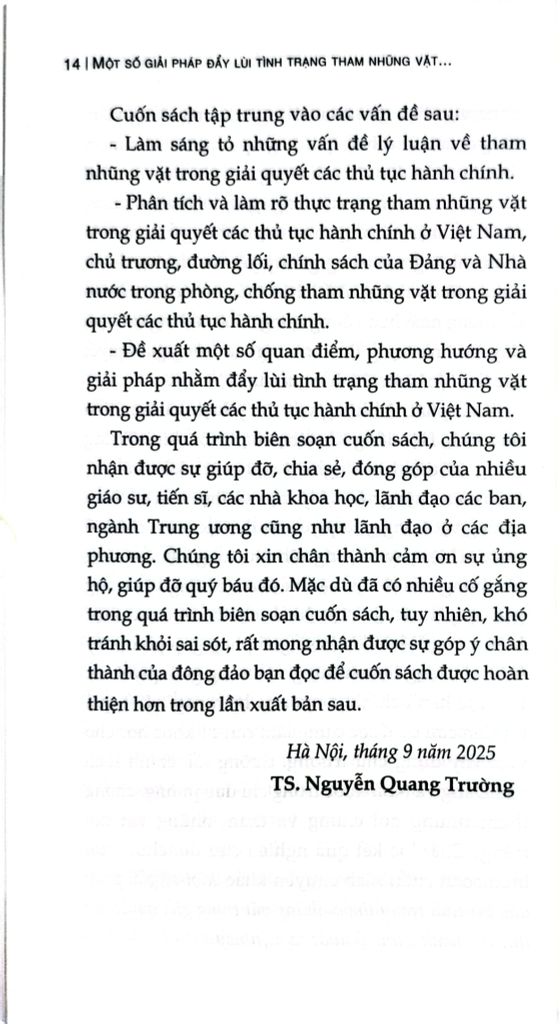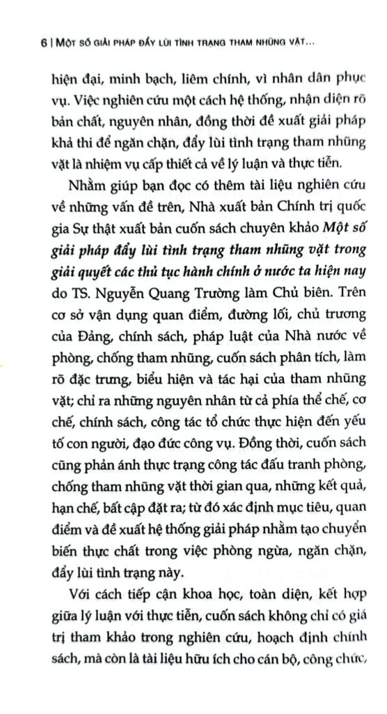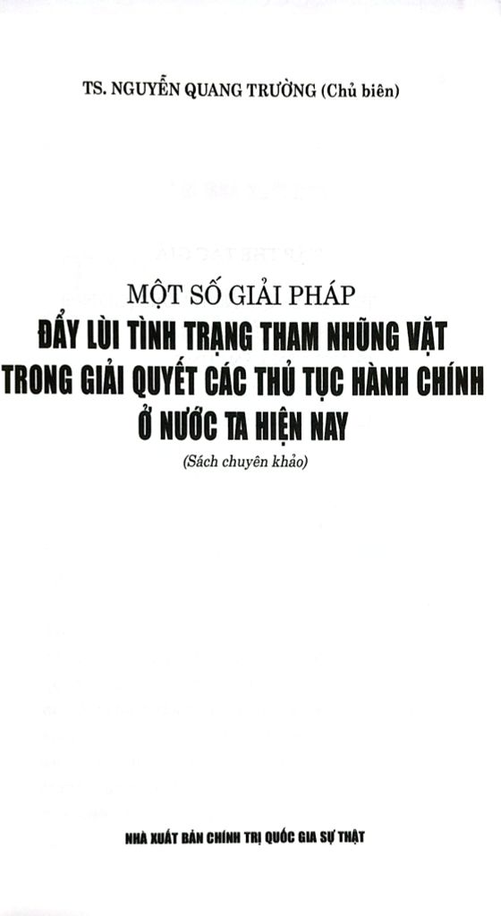 Cuốn sách chuyên khảo Một số giải pháp đẩy lùi tình trạng tham nhũng vặt trong giải quyết các thủ tục hành chính ở nước ta hiện nay do TS. Nguyễn Quang Trường làm Chủ biên. Trên cơ sở vận dụng quan điểm, đường lối, chủ trương của Đảng, chính sách, pháp luật của Nhà nước về phòng, chống tham nhũng, cuốn sách phân tích, làm rõ đặc trưng, biểu hiện và tác hại của tham nhũng vặt; chỉ ra những nguyên nhân từ cả phía thể chế, cơ chế, chính sách, công tác tổ chức thực hiện đến yếu tố con người, đạo đức công vụ. Đồng thời, cuốn sách cũng phản ánh thực trạng công tác đấu tranh phòng, chống tham nhũng vặt thời gian qua, những kết quả, hạn chế, bất cập đặt ra; từ đó xác định mục tiêu, quan điểm và đề xuất hệ thống giải pháp nhằm tạo chuyển biến thực chất trong việc phòng ngừa, ngăn chặn,đẩy lùi tình trạng này.