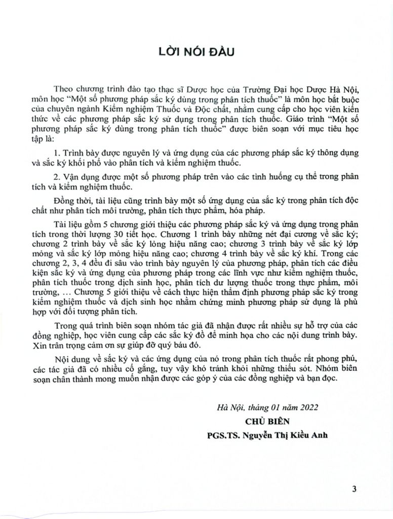 Theo chương trình đào tạo thạc sĩ Dược học của Trường Đại học Dược Hà Nội, môn học “Một số phương pháp sắc ký dùng trong phân tích thuốc” là môn học bắt buộc của chuyên ngành Kiểm nghiệm Thuốc và Độc chất, nhằm cung cấp cho học viên kiến thức về các phương pháp sắc ký sử dụng trong phân tích thuốc. Giáo trình “Một số phương pháp sắc ký dùng trong phân tích thuốc” được biên soạn với mục tiêu học