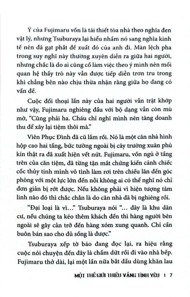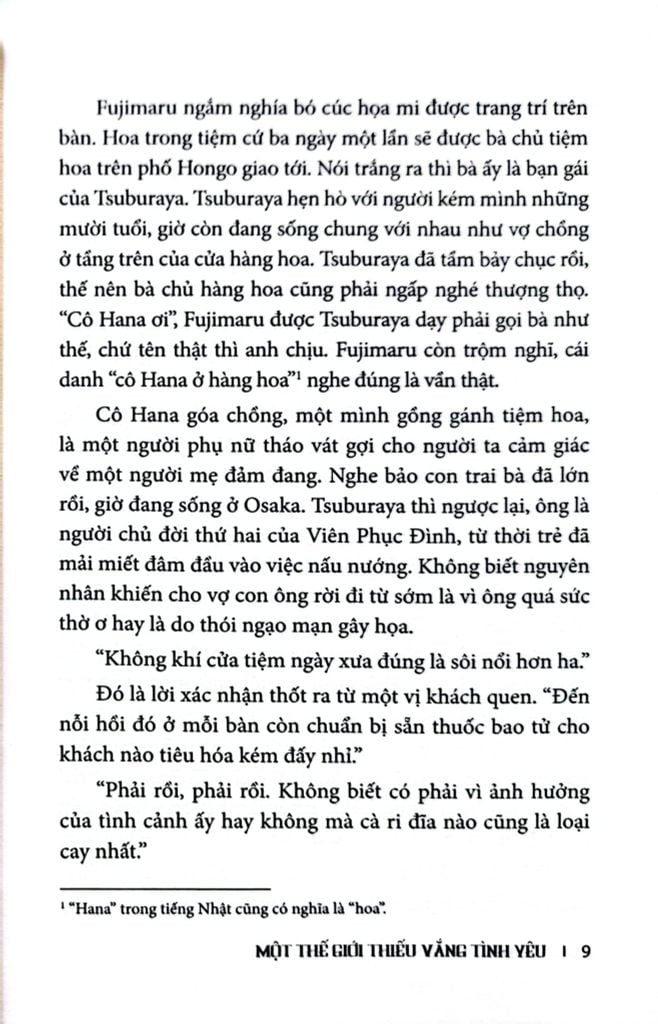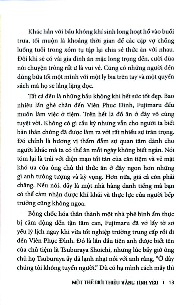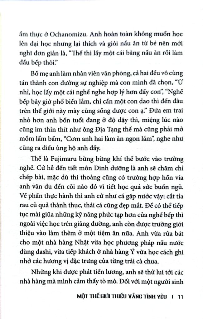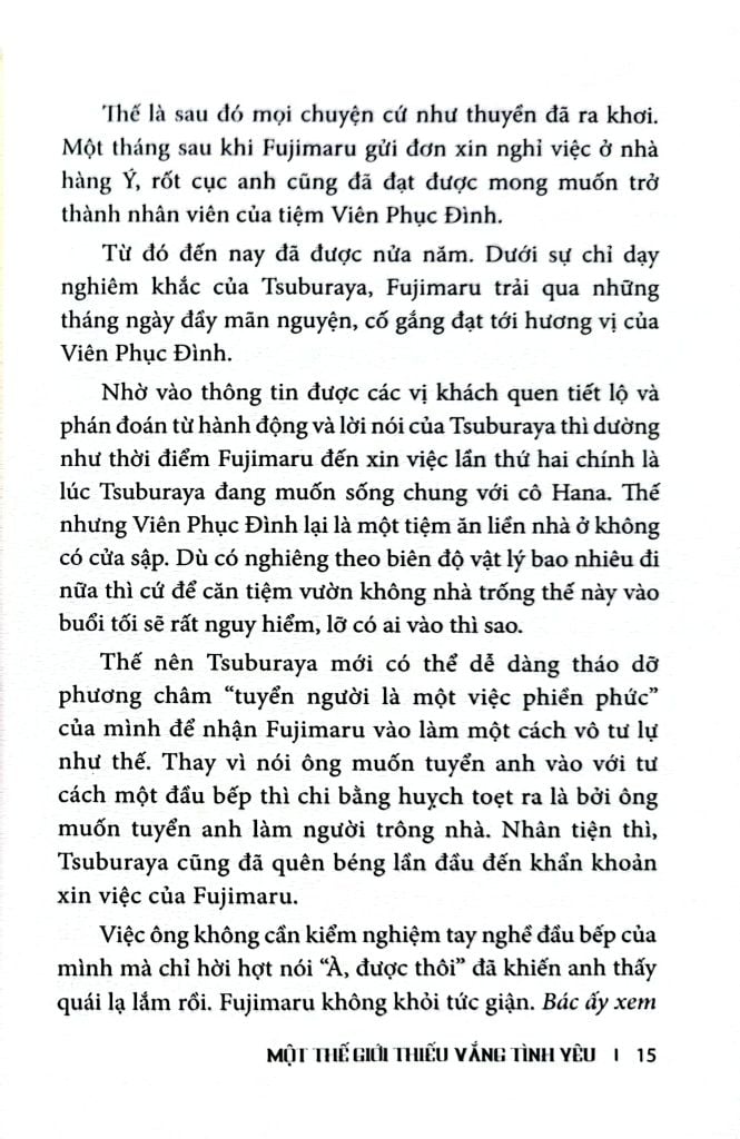 Trong một lần tình cờ Fujimaru đi giao thức ăn cho một nhóm nghiên cứu sinh của trường đại học gần đó, anh biết đến Motomura và nhóm nghiên cứu thực vật của cô. Motomura, một cô gái ngày ngày đắm mình trong nghiên cứu khoa học, chẳng màng tới những việc xảy ra xung quanh. Sau vài lần tiếp xúc, Fujimaru đã cảm mến cô gái trong mắt chỉ có thực vật này. Ở bên cô, Fujimaru dần khám phá ra nhiều điều thú vị về thế giới thực vật muôn màu muôn vẻ - một thế giới thiếu vắng tình yêu. Anh cảm thấy niềm nhiệt huyết của cô dành cho thực vật thậm chí còn lớn lao hơn cả tình yêu bếp núc trong anh.Liệu giữa hai con người trẻ tuổi, nhiệt huyết vì đam mê có tồn tại tình yêu? Liệu Fujimaru có thể làm rung động trái tim dành hết cho nghiên cứu thực vật của Motomura được hay không? Mời các bạn đón đọc Một Thế Giới Thiếu Vắng Tình Yêu nhé.