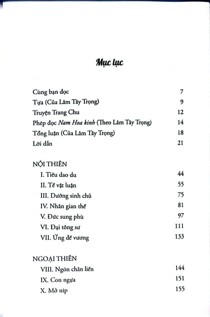 - Nội thiên (7 thiên): Tiêu dao du, Tề vật luận, Dưỡng sinh chủ, Nhân gian thế, Đức sung phù, Đại tông sư, Ứng đế vương.