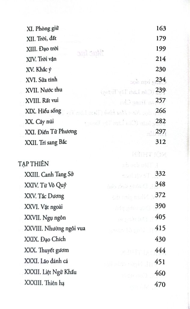 - Tạp thiên (11 thiên): Canh Tang Sở, Từ Vô Quỷ, Tắc Dương, Vật ngoài, Ngụ ngôn, Nhường ngôi vua, Đạo Chích, Thuyết gươm, Lão đánh cá, Liệt Ngữ Khấu, Thiên hạ.