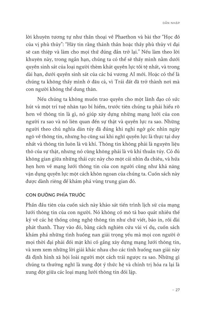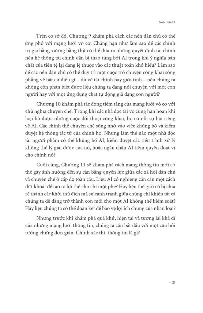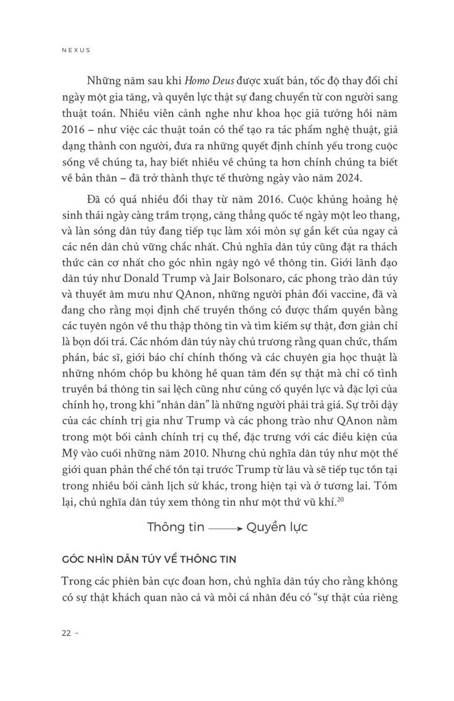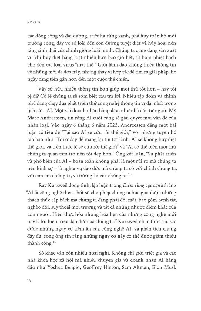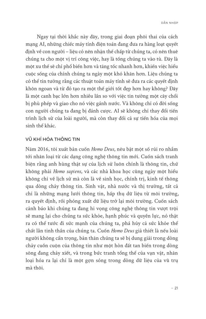 Trong 100.000 năm qua, loài Sapiens đã tích lũy được sức mạnh to lớn. Song bất chấp mọi khám phá, phát minh và chinh phục, giờ đây chúng ta thấy mình đang ở trong một cuộc khủng hoảng hiện sinh. Thế giới đang trên bờ vực sụp đổ sinh thái. Căng thẳng chính trị đang gia tăng. Thông tin sai lệch tràn lan. Và chúng ta đang bước vào kỷ nguyên của AI – một mạng lưới thông tin hoàn toàn mới.