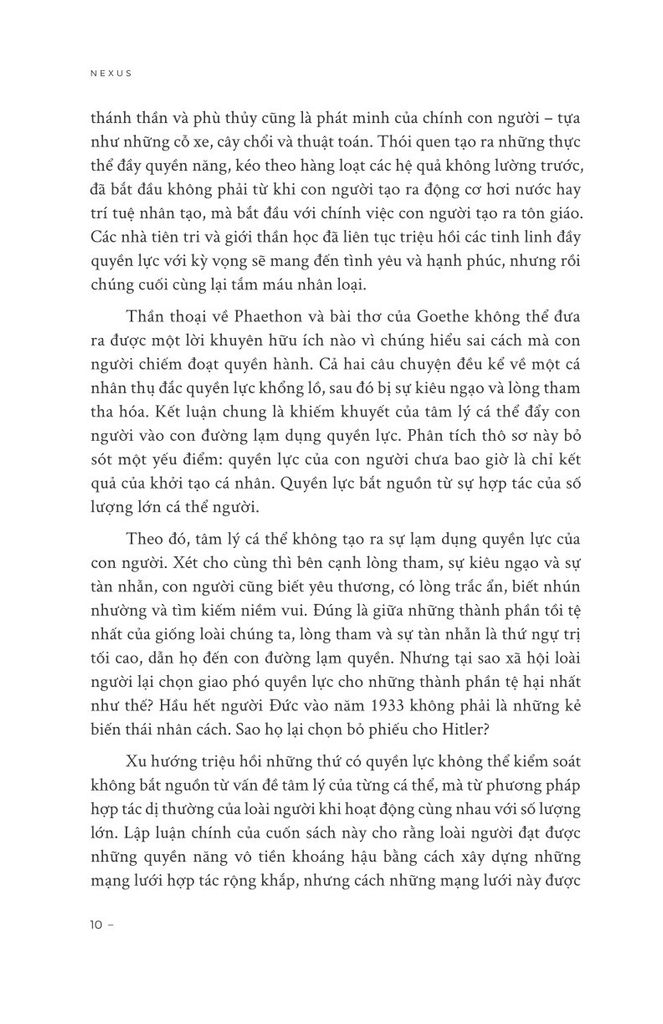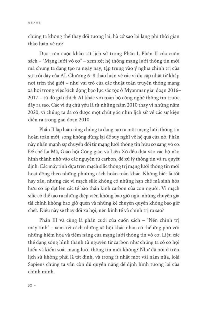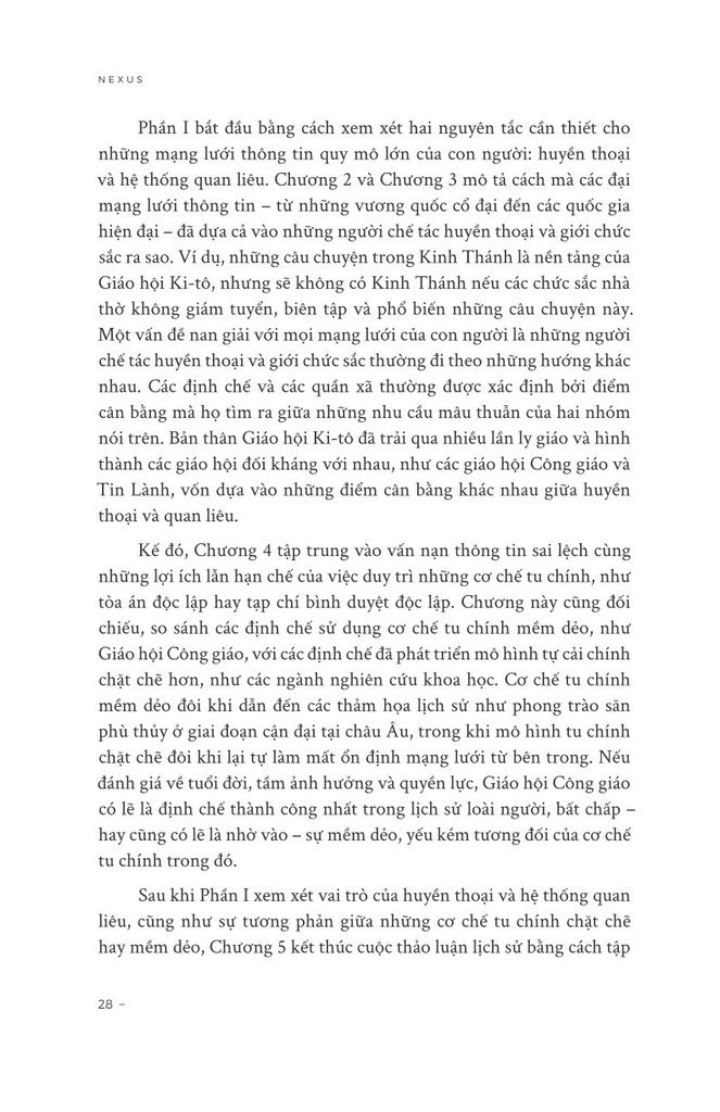 “Nexus” nhìn lịch sử loài người qua lăng kính dài để xem xét dòng chảy thông tin đã đưa chúng ta đến ngày nay như thế nào. Từ thời Đồ đá qua quá trình điển hóa Kinh Thánh, rồi phát minh ra in ấn, sự trỗi dậy của phương tiện truyền thông đại chúng và sự nổi lên gần đây của chủ nghĩa dân túy, Yuval Noah Harari đã xem xét mối quan hệ phức tạp giữa thông tin và sự thật, quan liêu và huyền thoại, trí tuệ và quyền lực. Ông khám phá cách các hệ thống như Đế chế La Mã, Giáo hội Công giáo sử dụng thông tin để đạt được mục tiêu, dù tốt hay xấu. Ông cũng đề cập đến những lựa chọn cấp bách mà chúng ta phải đối mặt khi AI xuất hiện.