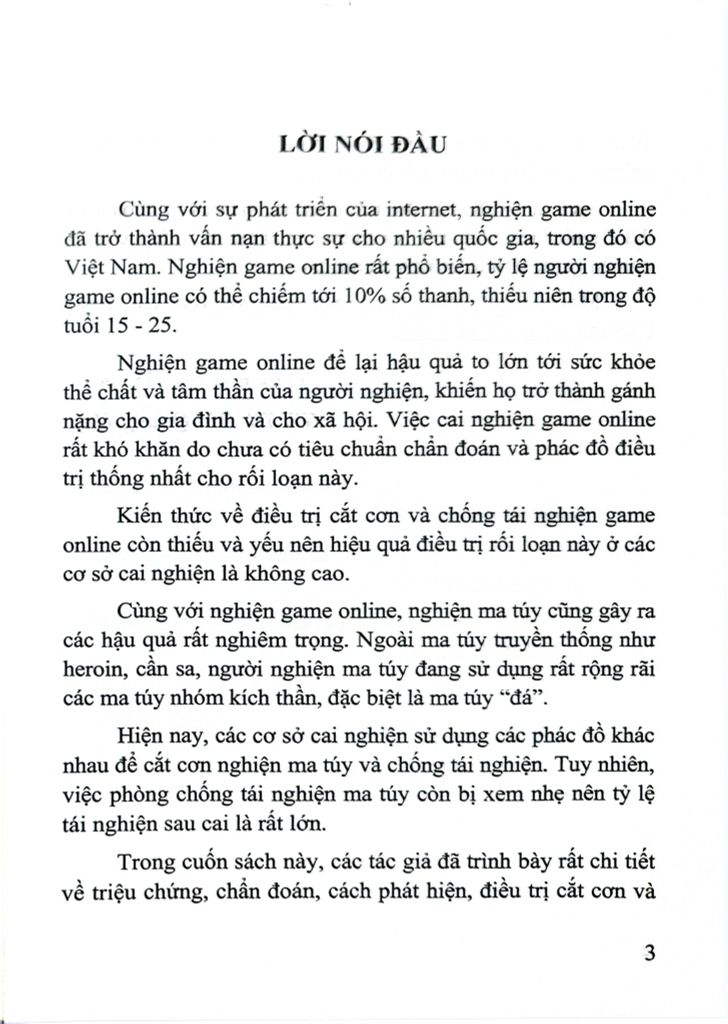 Trong cuốn sách này, các tác giả đã trình bày rất chi tiết về triệu chứng, chẩn đoán, cách phát hiện, điều trị cắt cơn và điều trị chống tái nghiện cho những người nghiện game online và những người nghiện ma túy.